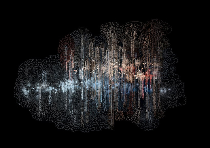 Composer, visual artist and creative coder Espen Kluge (b. 1983) is fascinated by the exploration of semi-randomness in moments of improvization, as reflected in the 2019 ‘Alternatives’ and 2022 ‘Lyrical Convergence’ series. Both artworks use the same set of data but different algorithms, as a showcase of the diversity of human perception, objectivity and subjectivity. The portraits are monumental but vivid with vector-based lines that evoke a certain dynamism. The artist hand-writes the algorithm in pure javascript: the code takes photographs as input, loops through all the pixels in a raster image, chooses some at semi-random, and then engages pixels by putting lines between them. Each unique result expresses something personal, vibrant, imaginative and lyrical.