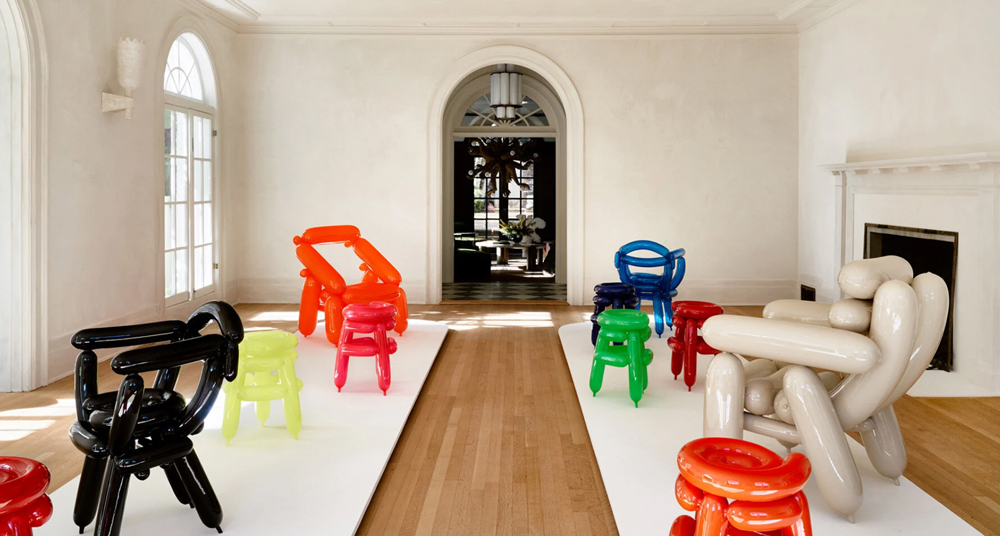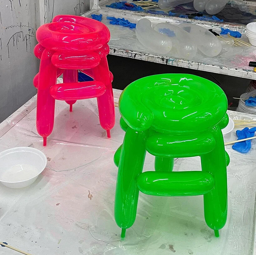 seungjin yang blows candy-colored balloons into solid chairs, stools and benches