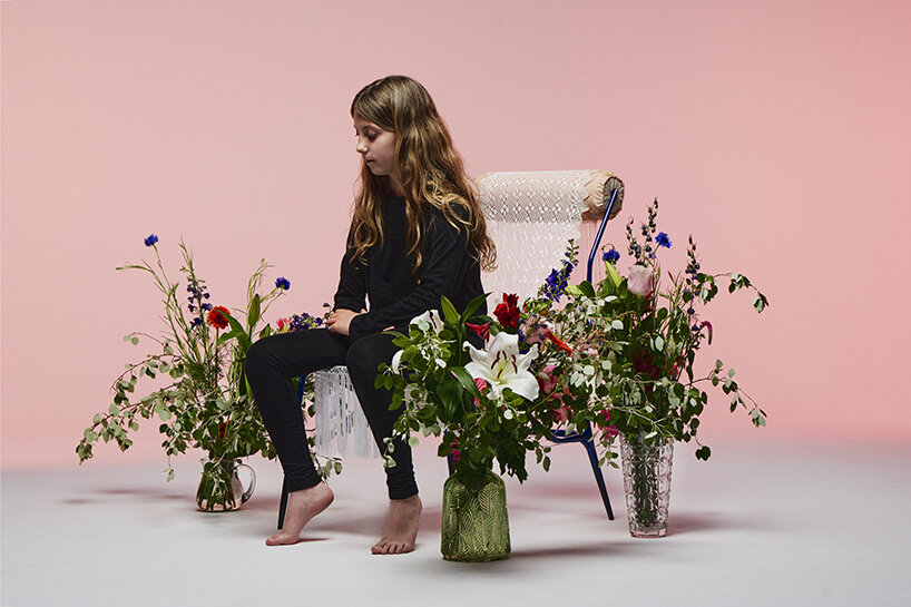 To emphasize the lace-made backrest and seat, the structure was reduced to a minimalist expression, following a geometry resembling that of an arachnid’s body, a creature with which women who make bobbin lace are often associated.