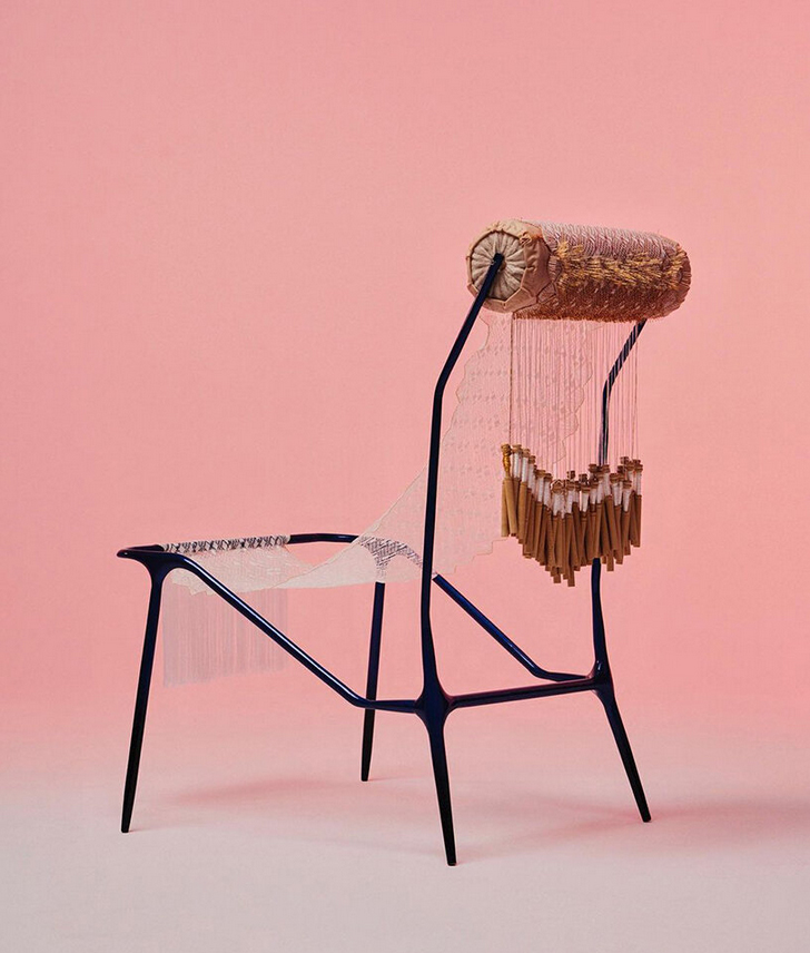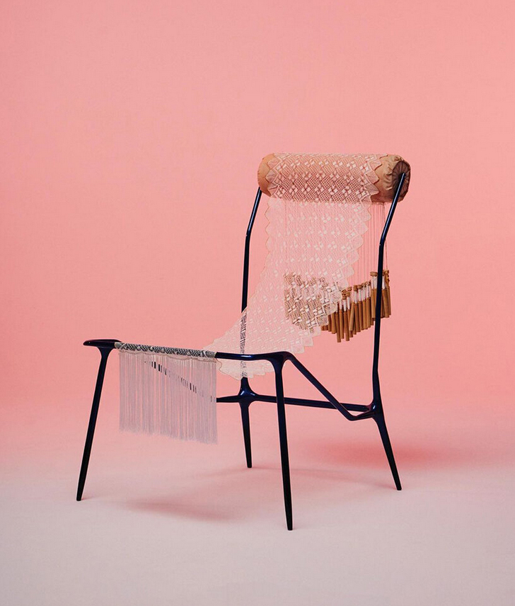 Designboom_ For the past four years, Spanish architect Lluís Alexandre Casanovas Blanco worked closely with his mother, María Lluïsa Blanco Estébanez, to develop the intriguing ‘UMT’ chair. Sporting a minimalist black frame and a delicate lace-made backrest and seat, the chair is both a furniture piece and an historical investigation into the politics of traditional weaving techniques, particularly the use of bobbin lace in decoration.