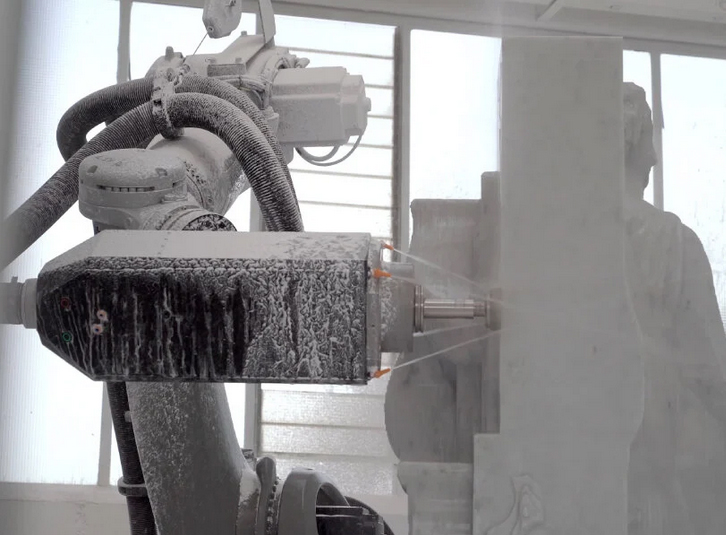 It is also possible, thanks to the self-programming software of the robot, that it goes on its own sculpting the product it wants to shape. After planning the workflow, the software nudges the robot chisel to select the types of tools it will use during the different stages of the process, from sculpting the material to polishing it and even dusting it off with bursts of water.