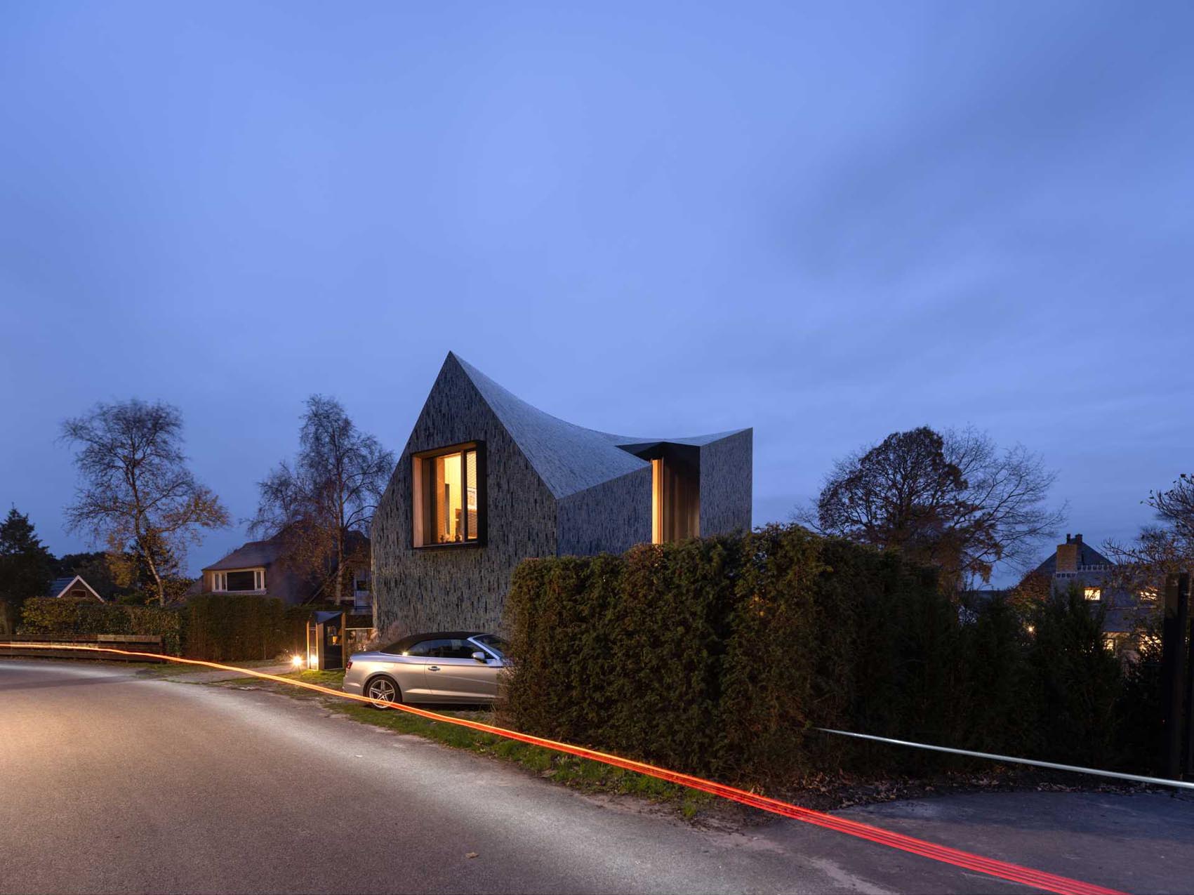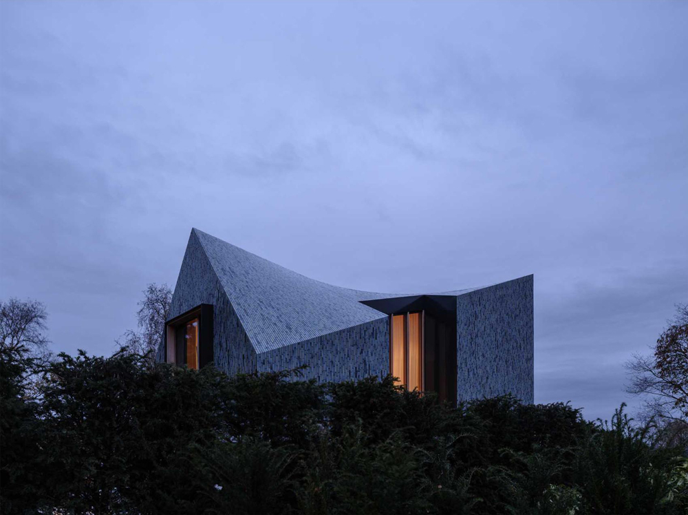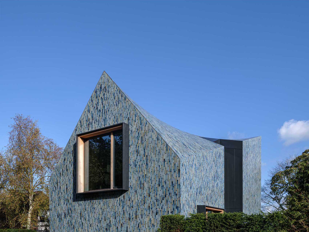 The exterior of the house is clad in a single material, a custom ceramic tile covering that wraps the entire building.