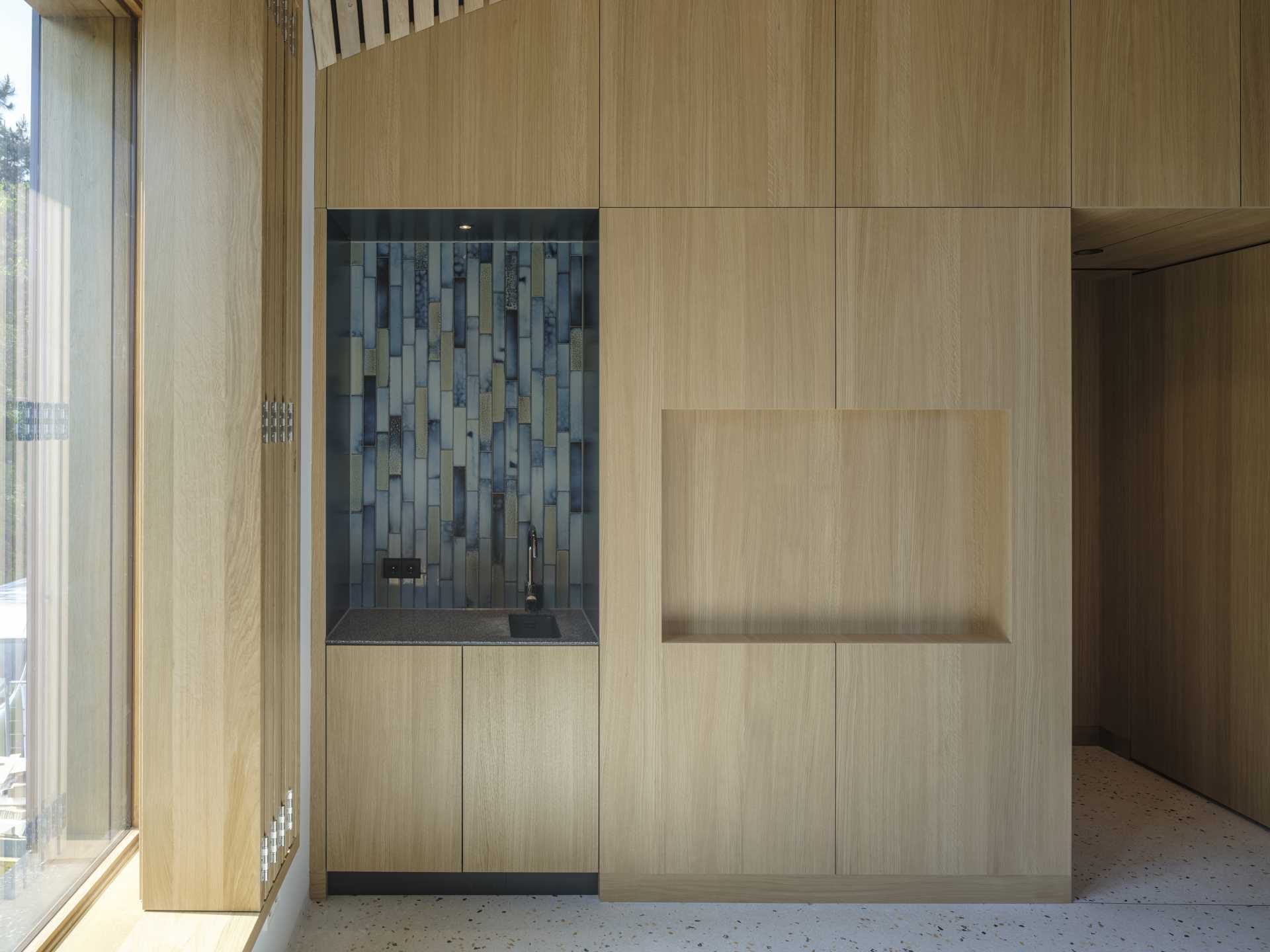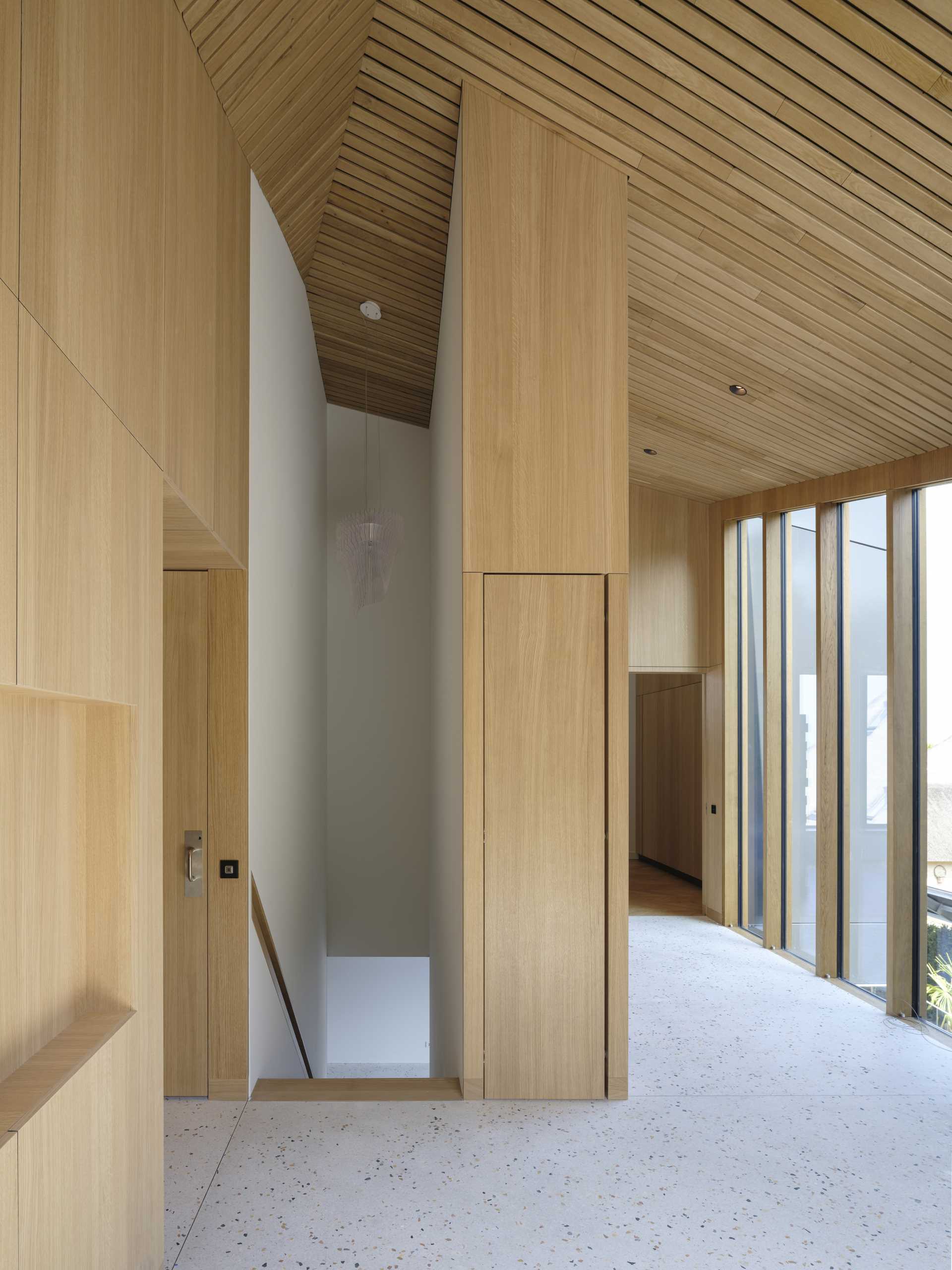 Inside the home, all of the living spaces are organized around the curtain wall-enclosed voids and an enclosed wood-cladded core.