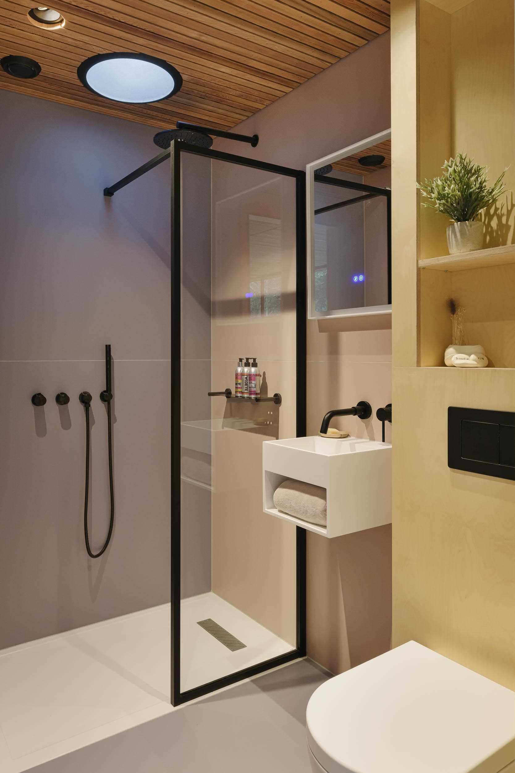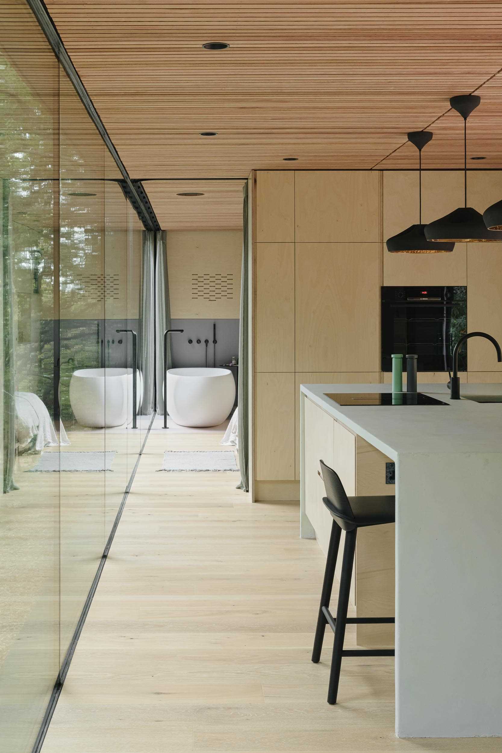 Glass walls and the wood ceiling connect the kitchen to the bedroom.