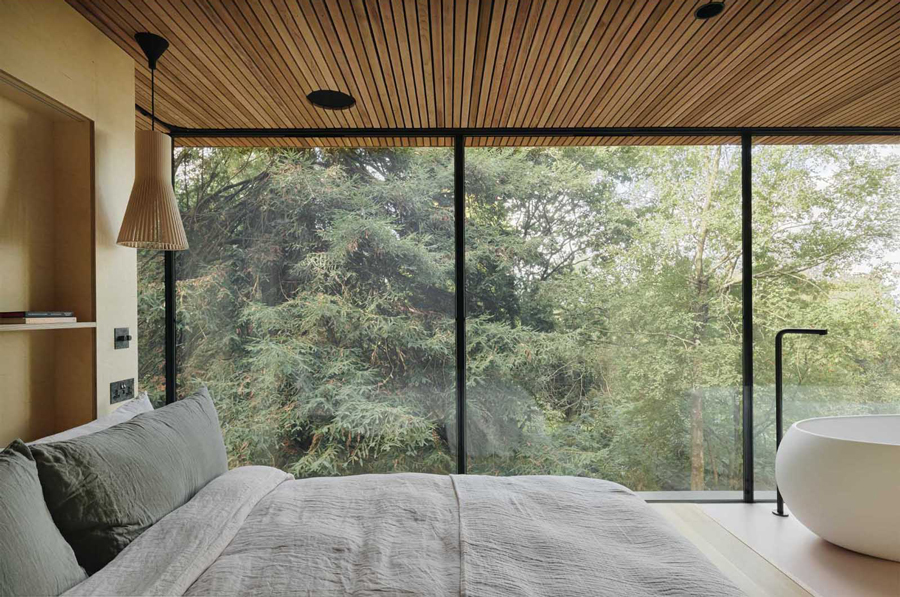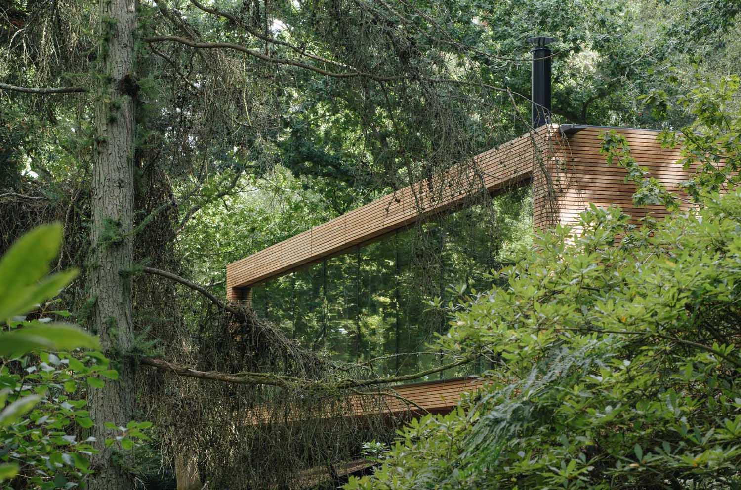 Located in East Sussex, England, this small lodge, clad in western red cedar, appears elevated amongst the trees as the ground levels fall away below.