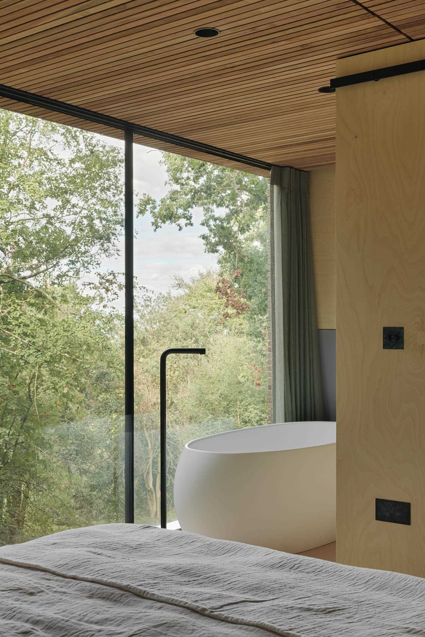 Opposite the bed, there’s a freestanding bathtub by the windows, while the ensuite bathroom is located behind a sliding door.