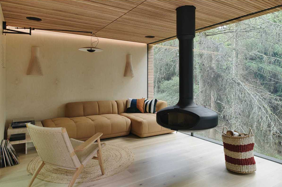 The nearby bespoke kitchen sits in the middle of the lodge, and though compact, has been carefully configured to provide space to both cook and dine. Birch plywood has been chosen for the cabinet materials.