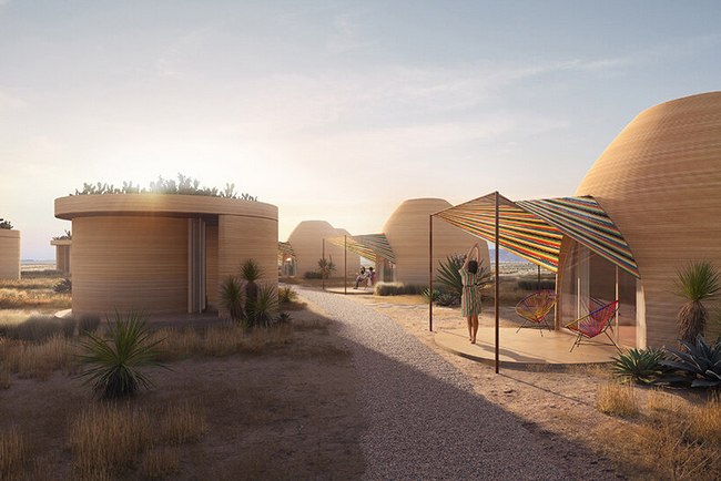 Designboom_ Liz Lambert, founder of Marfa’s bohemian hotel brand El Cosmico, teams up with ICON and Bjarke Ingels Group (BIG) to reimagine the future of luxury camping in the Texas desert. As the leader of advanced construction technologies and pioneers of large-scale 3D printing, ICON has long experimented with innovative forms and building methods — an approach which fits perfectly with the eccentric spirit of the nomadic El Cosmico, whose off-grid, 21-acre campground currently comprises a scattering of tents, yurts, teepees, and trailers.