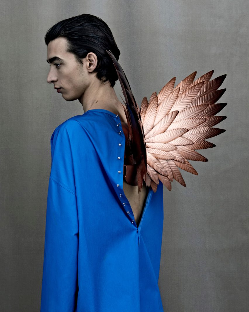 Other metal pieces were presented throughout the show including sets of feathered wings that emerged from beneath open-backed shirts and recalled renaissance paintings of cupid.