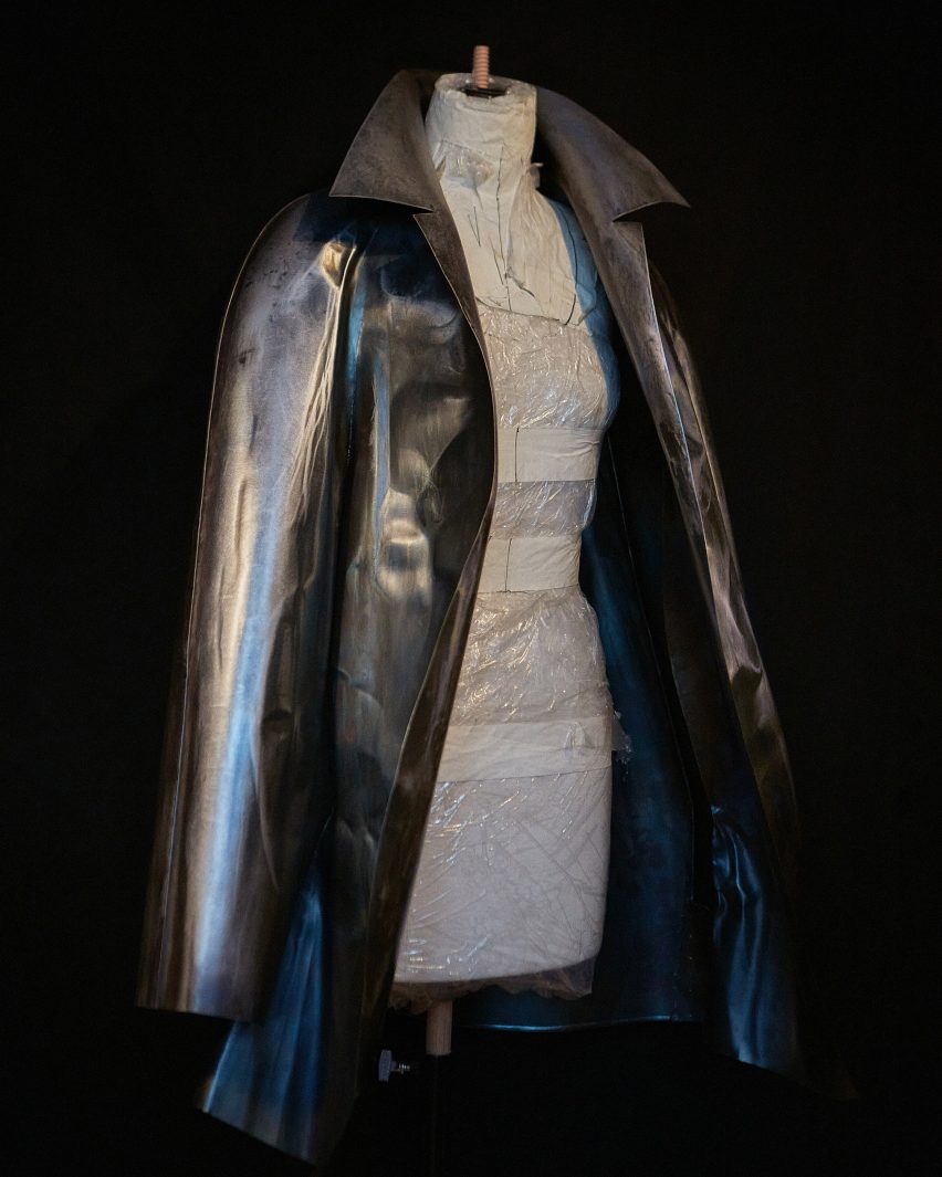 The metal was treated to produce a patina that aimed to naturally highlight light and shadow as it hits the metallic surface of the garment. Each garment takes between 25 and 30 days to complete and weighs eight kilograms.