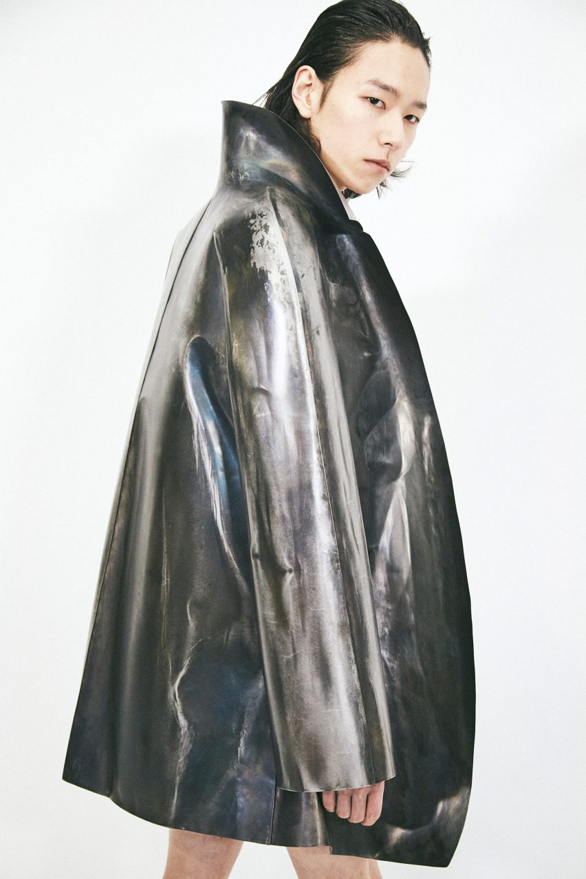 The first of the metal jackets to appear in the show was constructed from copper, the second followed later in the collection and contrasted to the former boasting a wholly pewter construction with a grey-patinated finish.