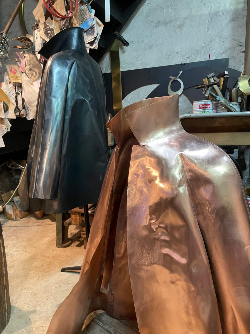 Much like typical garment production, Hirsch explained he treats the metal like fabric, using patterns to cut sheets of copper and pewter which are then shaped and fused together to create the solid metal garment.