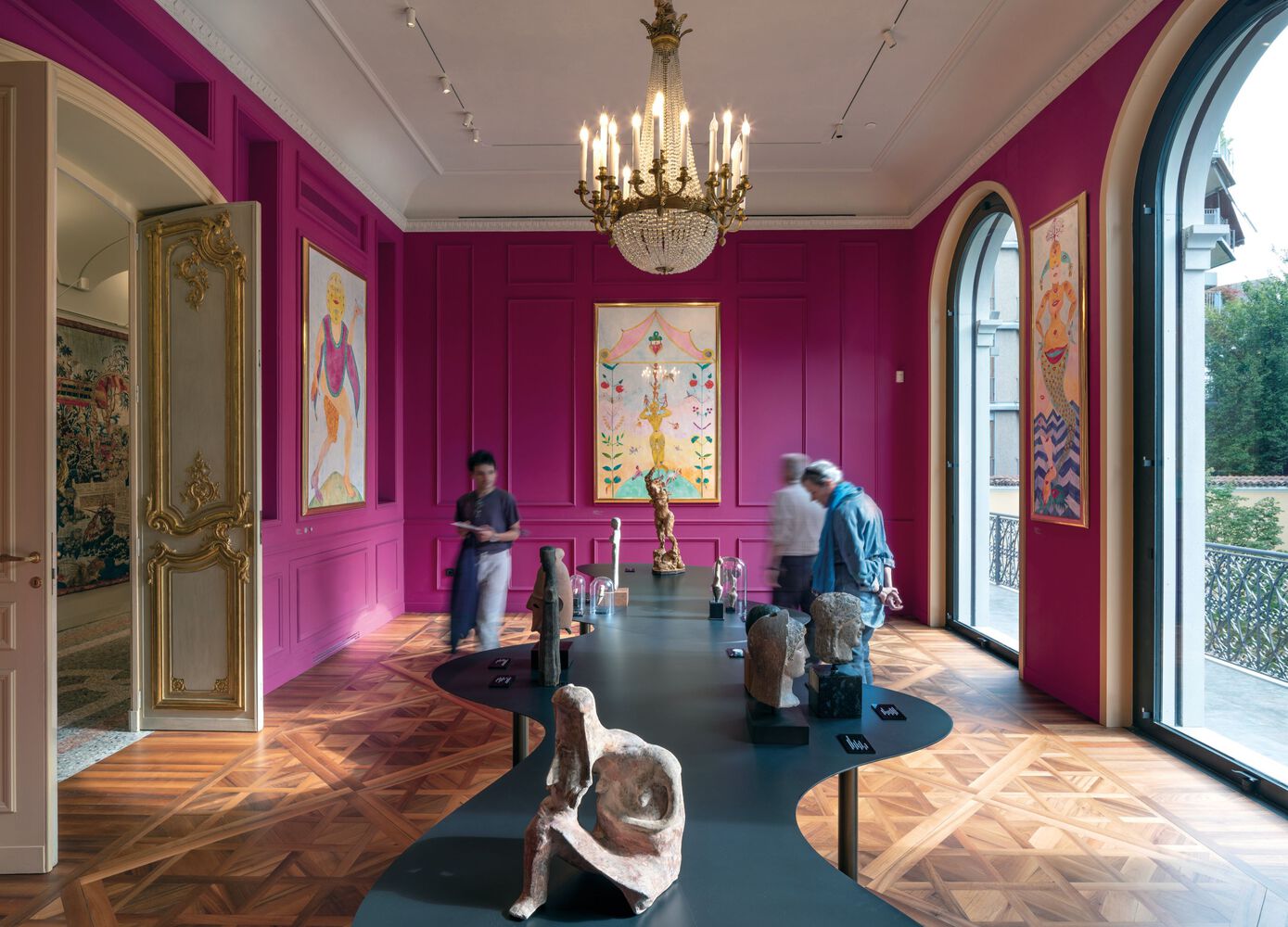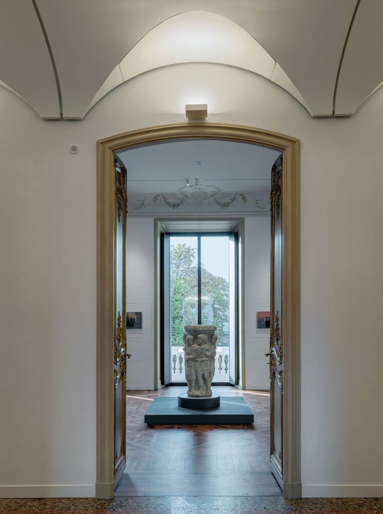 Two hundred highlights from the Foundation’s collection of ancient Etruscan artifacts are displayed in custom-made cases, designed by Mario Cucinella Architects, within the limestone-lined galleries of the otherworldly spaces located in the “Hypogeum Floor” directly beneath the palazzo. On display are cinerary urns, vases, jewelry, and bronzes including the celebrated Cernuschi Warrior, a votive warrior god dating from the late-6th century to early-5th century BC. Works by contemporary artists – like Alberto Giacometti, Pablo Picasso, Arturo Martini, Lucio Fontana, and William Kentridge are shown alongside artifacts created between two and three thousand years ago.