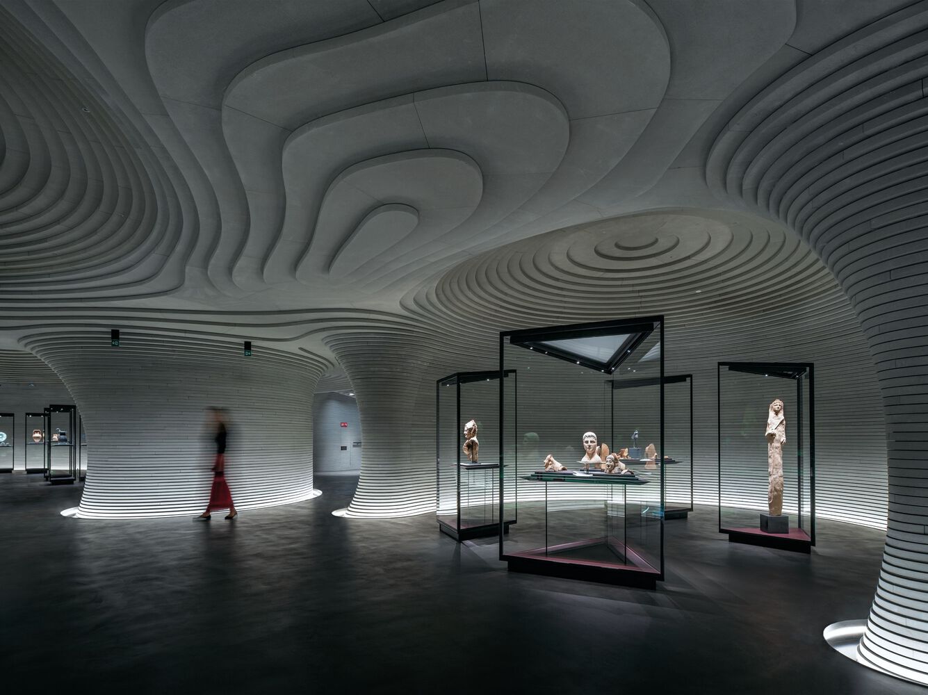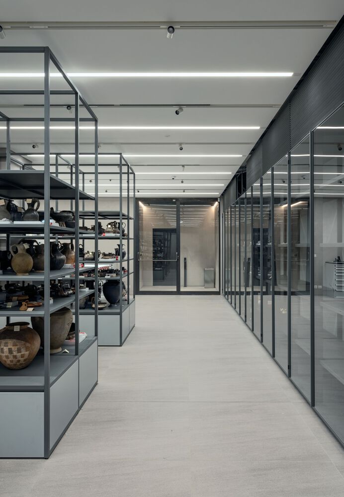 This architectural journey through time and culture, connecting life and afterlife, past, present, and future over seven stories has involved a bold engineering challenge. “At one point, the building was virtually suspended in mid-air”, says Mario Cucinella, referencing the period during which the superstructure of the palazzo was balanced on slim temporary foundations as the volume for the underground museum and the service floor beneath it was excavated. “Coincidentally”, adds Cucinella, “this theme of suspension is also apparent in the concept for the Etruscan archaeology galleries. We wanted to create a suspended ambiance. That’s why the Etruscan vases rest on almost invisible bases giving the impression that they are floating in mid-air.”