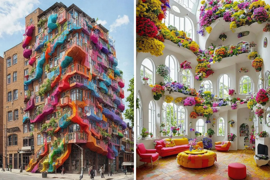 Indian-origin Architectural Designer Shail Patel has a supremely good command over Midjourney, weaving together whimsical images of bubble homes and vehicles, vivid facades for luxury brand shops, and combining art and design in unusual ways. Shail’s designs are almost always grandiose, but have an element about them that still brings a childlike curiosity, whether it’s bubble-shaped designs, or entire fashion gowns made out of greenery.