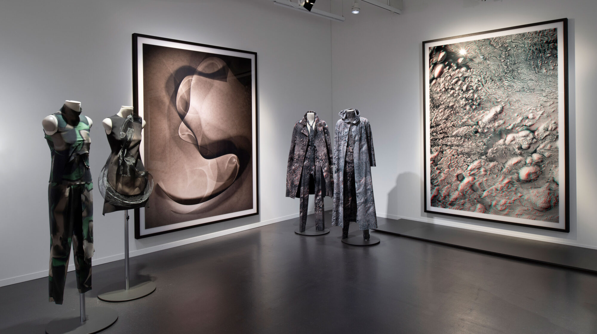 A benchmark Akris collection was Fall 2014. Kriemler created glowing LED-illuminated constellation dresses and photo realist lunar and nightscape dresses based on German photographer Thomas Ruff’s series. Ruff was in attendance for the opening, and his photos lined the walls, orbiting the clothes. The images range from celestial to suburban. The moon and stars segue to zoom in on the intimately eerie green-lit night vision surveillance images.
