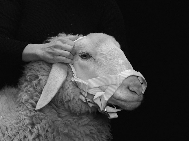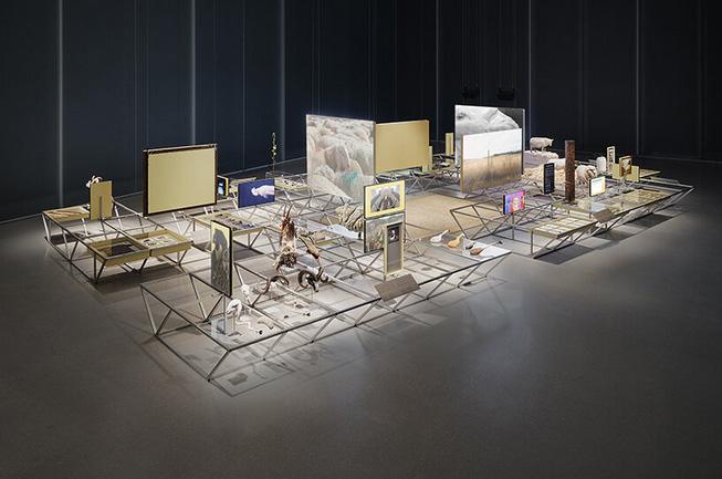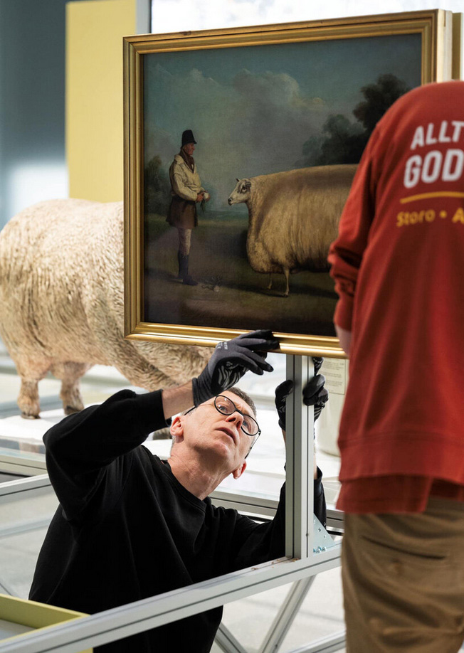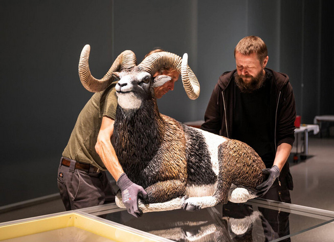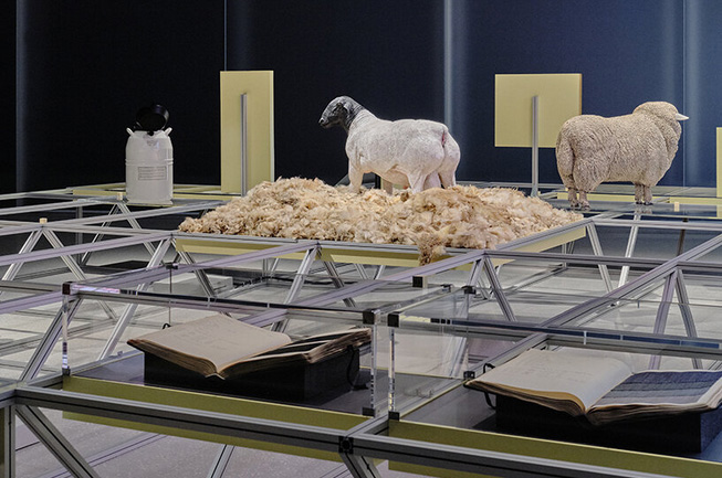 The display presents a thought-provoking reimagining of the traditional diorama display. Typically utilized in natural history museums to depict static scenes from the natural world, this installation deconstructs the diorama concept. It incorporates six life-sized replicas of diverse sheep breeds alongside a collection of documents, films, by-products from production processes, and various organic substances.