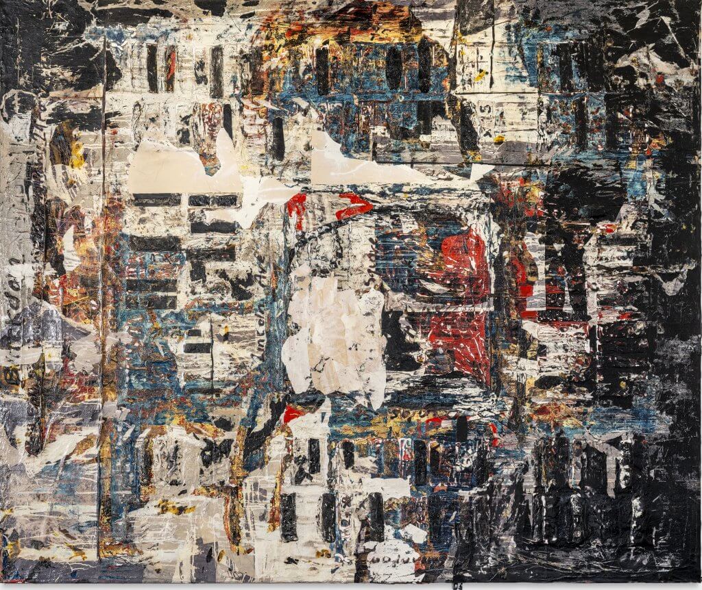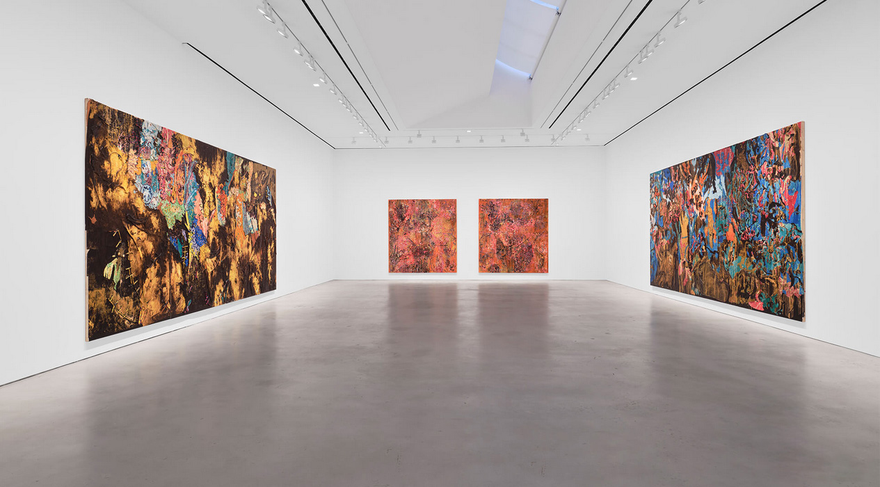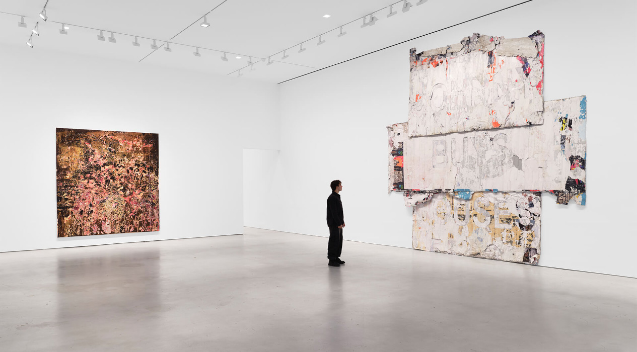 There are no major revelations in the dozen large-scale paintings made in Bradford’s distinctive mode incorporating found paper. There are no misses either. As grand and impressive as ever, he has refined his working method, which manages to mash together the history of allover abstraction, from Jackson Pollock to Gerhard Richter, with the paper he often sources from his surroundings, replicating the familiar visual effect of weathered and exposed layers of wheat-pasted posters or billboard advertisements marking city streets.