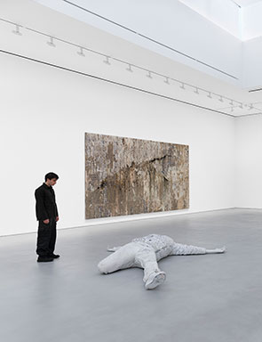 A close look at the sculpture reveals a rhythmic pattern of markings, where the surface of the figure has been worn away, borrowing a technique from his paintings, to reveal hints of color beneath.
