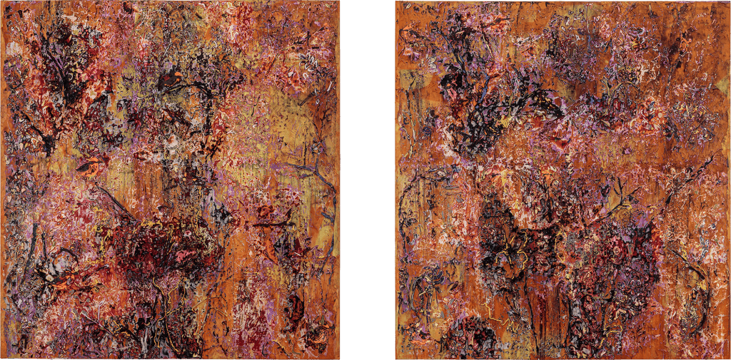 Throughout the gallery’s building, subdued tones and silvery metallics dominate. In “Johnny the Jaguar” (2023) the toothsome head of the titular big cat is discernible on an otherwise chaotic expanse that looks like a worn and tangled threadbare tapestry with only a shard of its original composition legible.