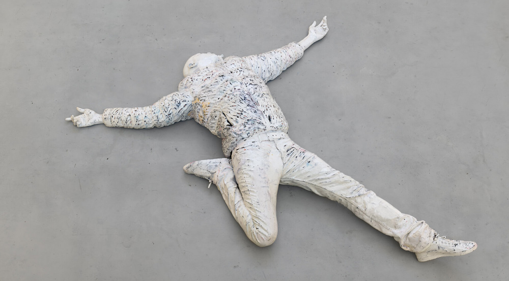 If the preteen Bradford of the “Death Drop” video never hits the ground, the Bradford of the second “Death Drop 2023” (2023), 50 years later, appears at a glance to never leave it. The larger than life sculpture, stretching some 10 feet long, depicts a fallen likeness of the artist prone and rendered in white, arms dramatically outstretched, his left leg extended and his right bent sharply at the knee beside him.