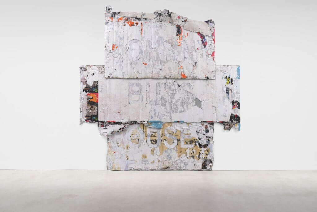 The towering assemblage of “Manifest Destiny” (2023) reads “Johnny Buys Houses” in bold white capitals and evokes the specter of gentrification. Bradford’s works often include signs and advertisements ripped from the walls and fences of public space. Here, the work’s flashes of color are provided partly by the remnants of a poster advertising a Foo Fighters concert.