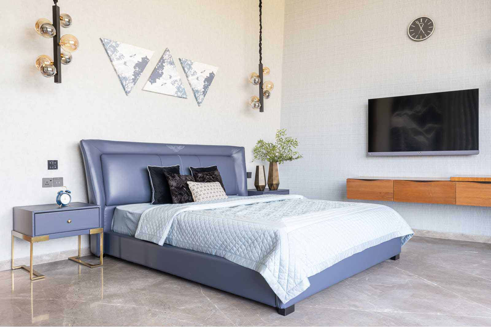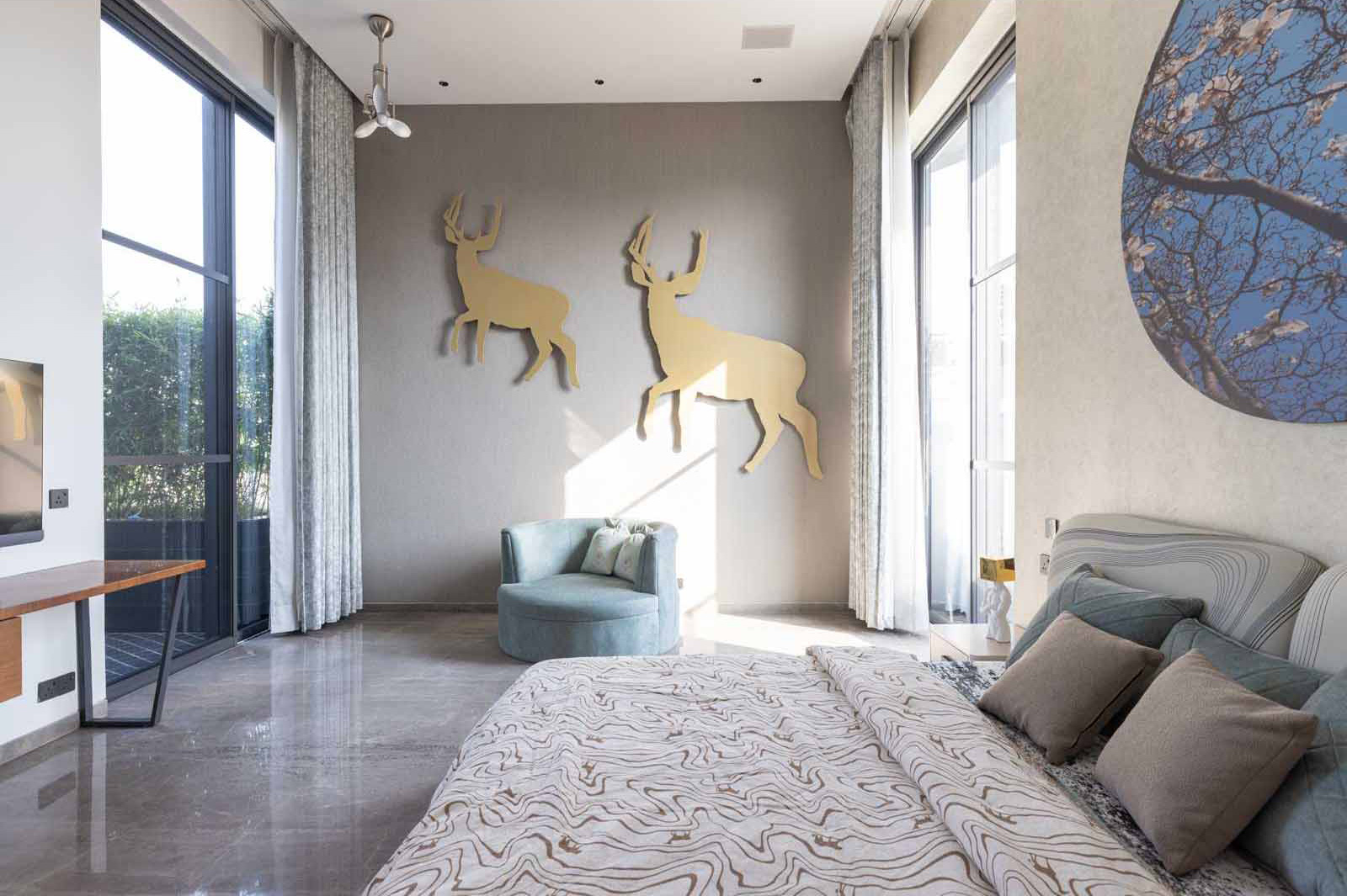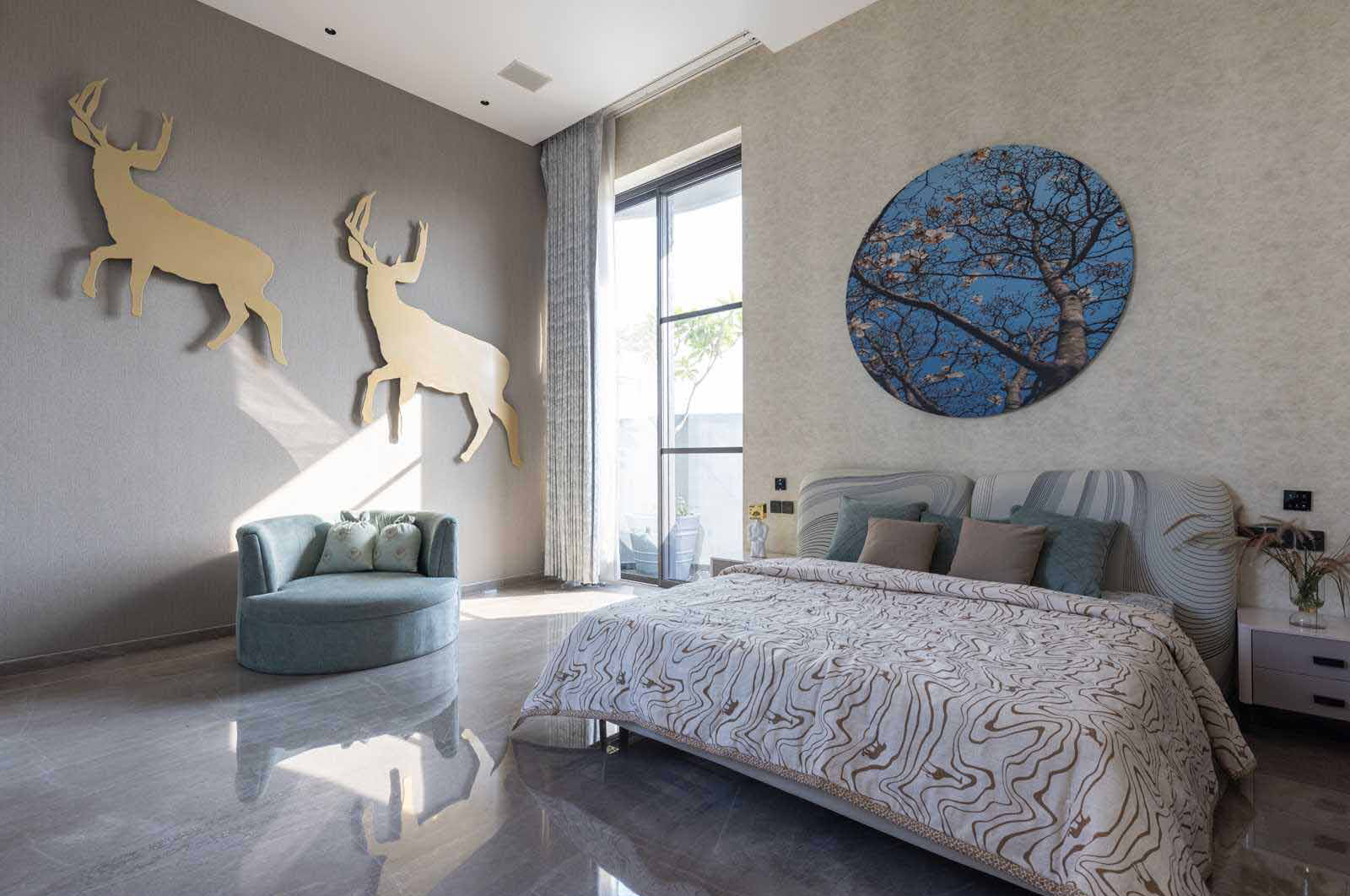 Each of the bedrooms has its own design, with details like built-in desks, large artwork, and accent walls.