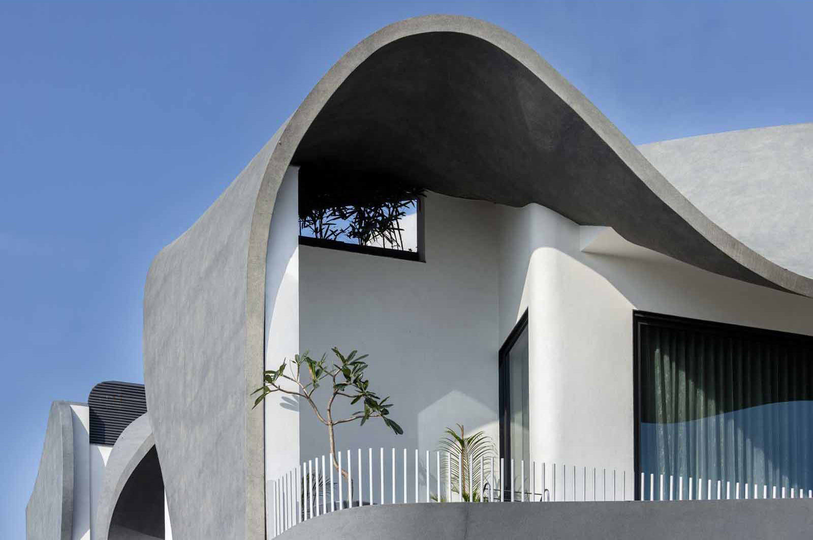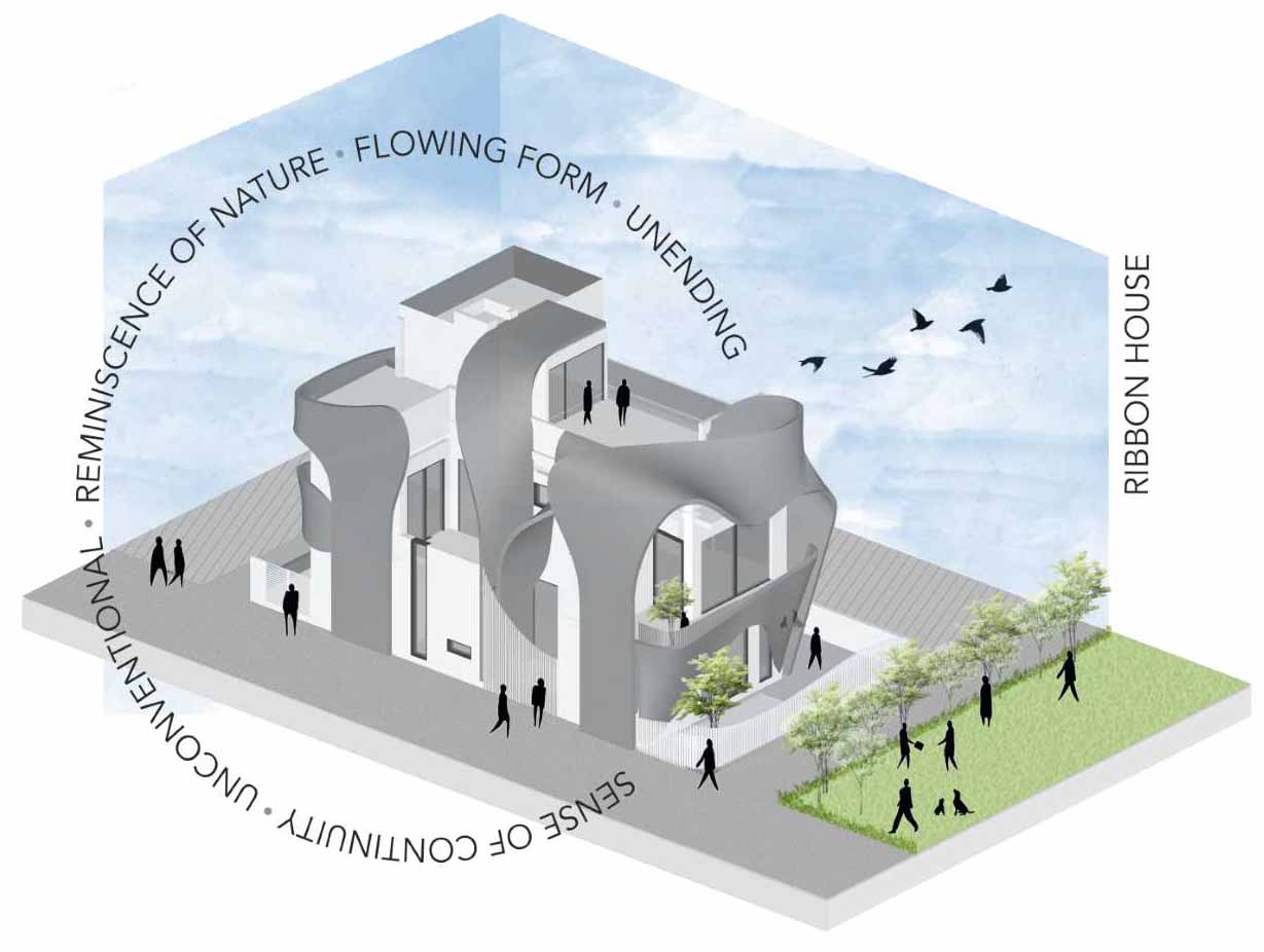 The exterior of the home draws inspiration from the folds of a ribbon as well as nature and its flowing form.