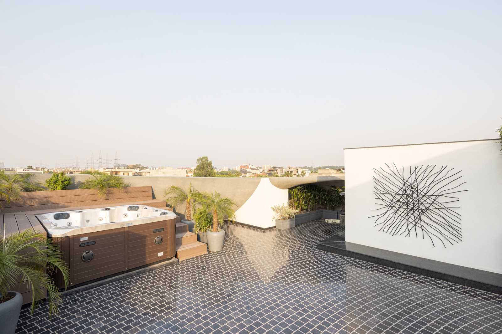 The rooftop expands the entertaining spaces and includes a hot tub, tile flooring, and seating.