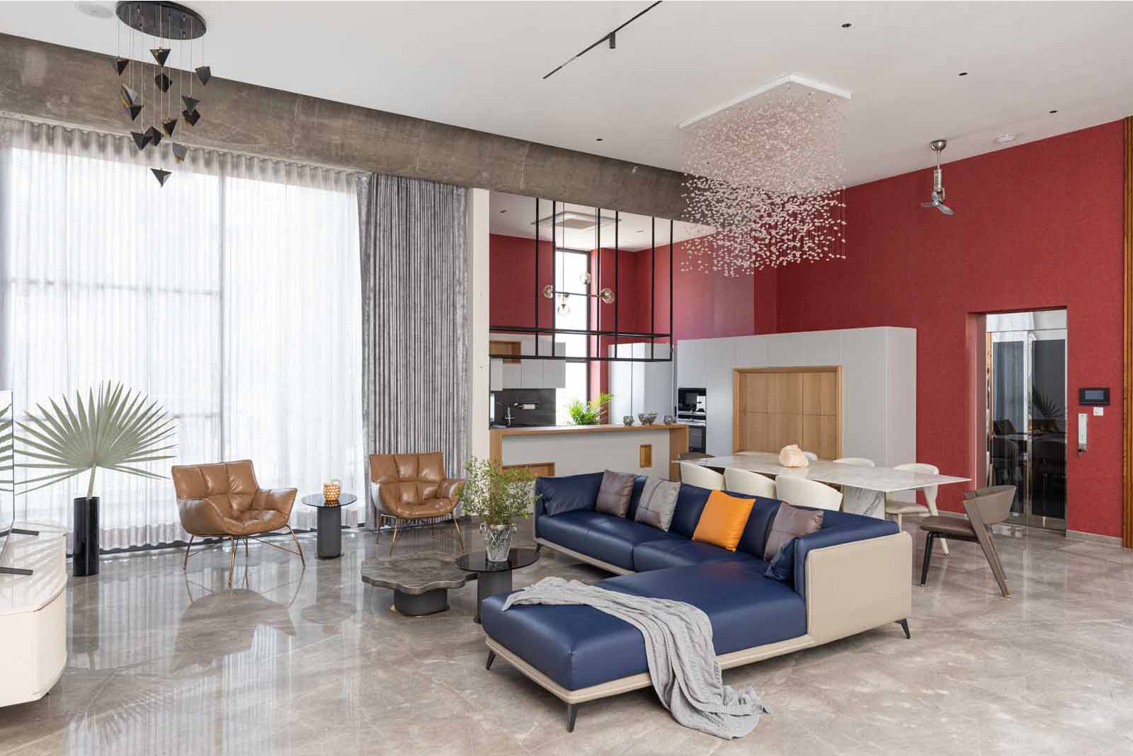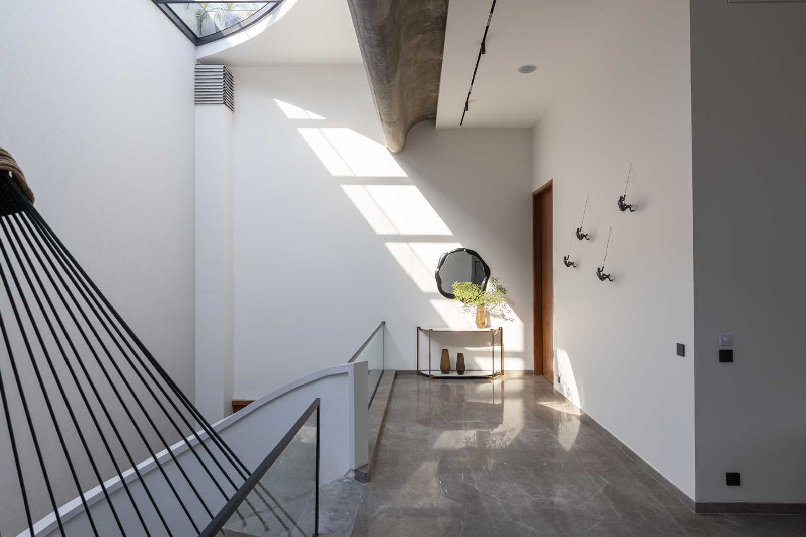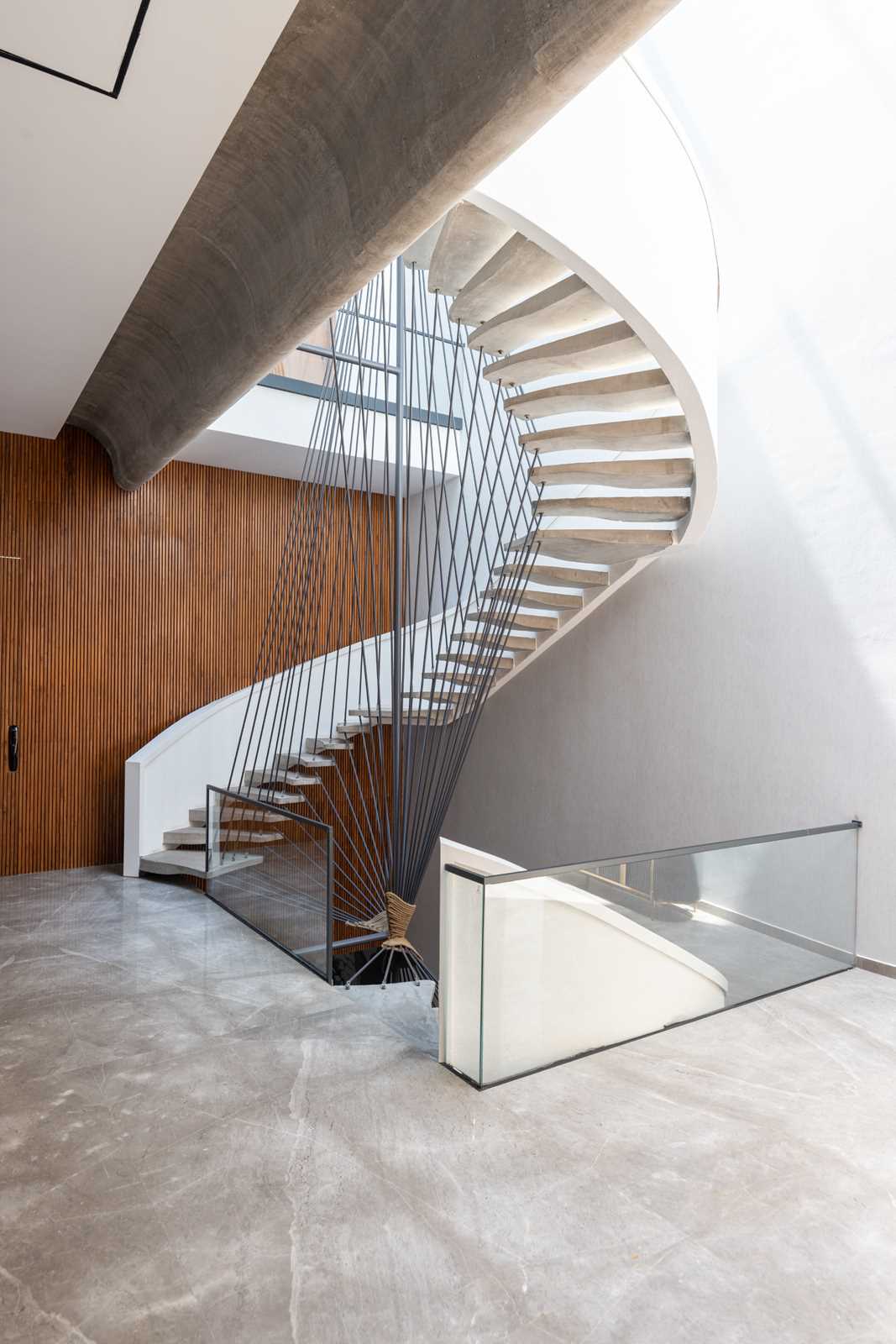 On the other side of the dining area is home to a spiral staircase with an artistic wire detail, giving the illusion of a puzzle, connecting the vertical spaces, and unfurling itself as one ascends to the upper floors.