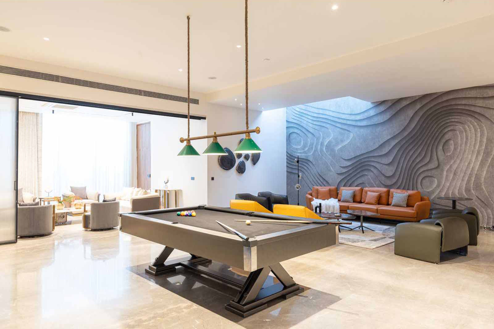 In a games room, there’s a large accent wall that provides a backdrop for the lounge area, while a pool table is centrally located in the space.