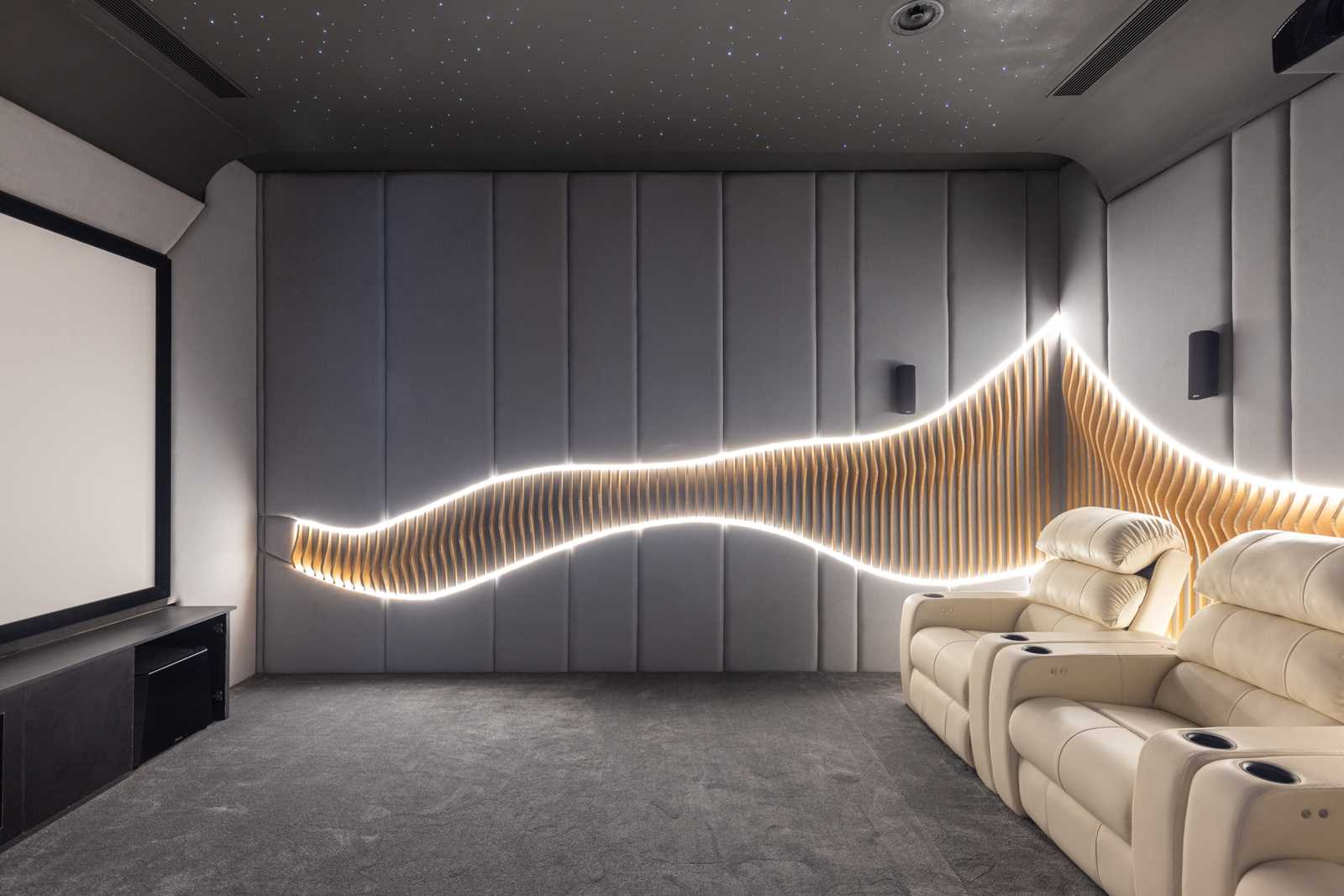 In the media room, the upholstered walls are punctuated by wooden ribs and LED lighting.