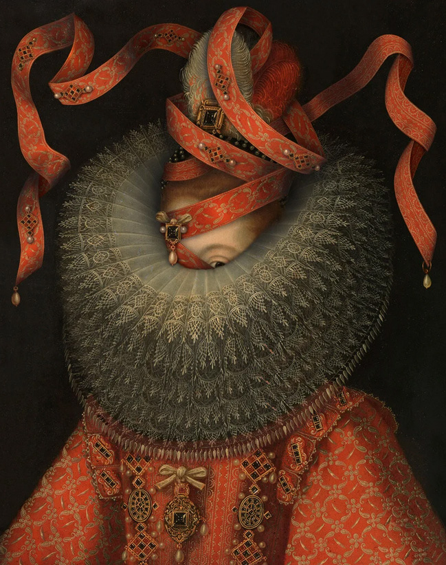 Designboom_ Running until 8th July 2023, Volker Hermes’s RUFF HOOD exhibition at London’s James Freeman Gallery brings a playful twist to historical portraits. Known for his Hidden Portraits series, the German artist digitally modifies renowned historical paintings by incorporating textures and patterns from the original images. Through this process, he creates masks and new embellishments that cover the subjects’ faces, offering a new perspective on the relationship between fashion and historical art.
