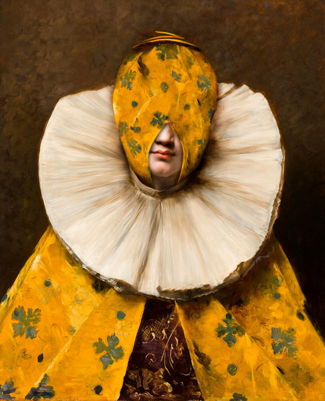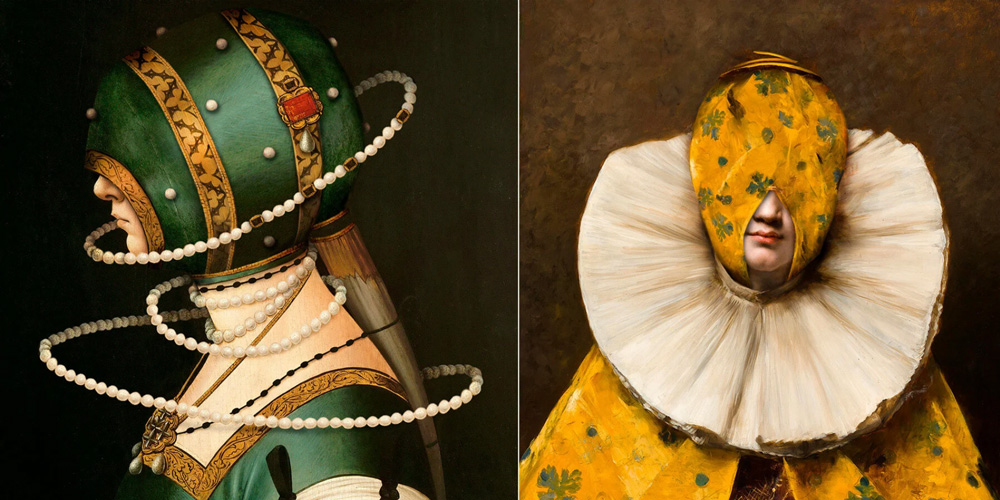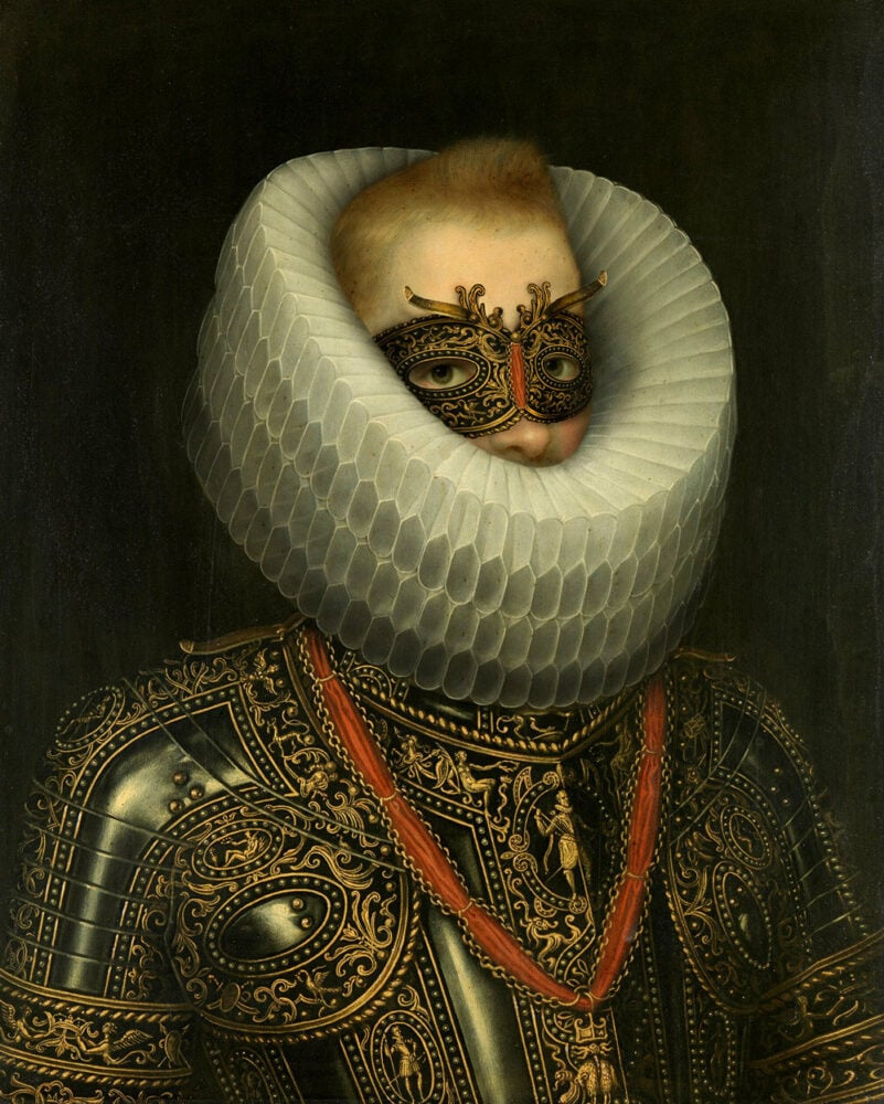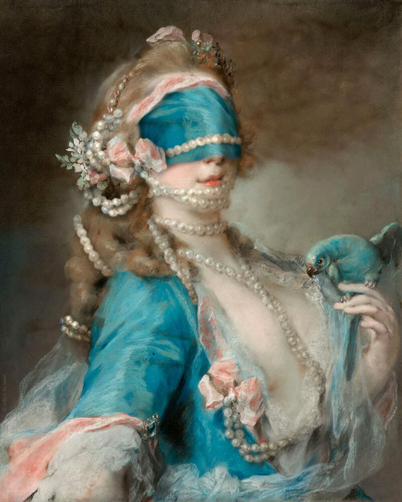 Playful and mischievous, Volker’s Portraits capture the lively essence of historical style while shedding light on the role of fashion in historical portraiture. The artworks emphasize the significance of elements such as fabric, opulence, and armor, which not only depict individuals but also represent society, its values, and its hierarchies. Often, viewers tend to overlook these elements and perceive them. However, by obscuring the faces of the characters and directing attention to these adornments, Volker’s work invites spectators to reconsider how fashion reflects a society’s codes and values. It encourages us to evaluate these expressions with a contemporary sensibility.