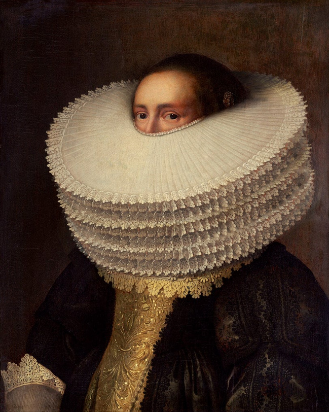 Similarly, another artwork based on a portrait by Rembrandt emphasizes the significance of ruffs, which were indicators of social status in 17th-century Holland. Volker’s portrayal of a woman shows her almost consumed by her large ruff, symbolizing excessive privilege. By obscuring the face, Volker taps into the dramatic potential of masks, which have been used in various forms of theater throughout history, from Greek theater to the Venice carnival to TV wrestling and more.
