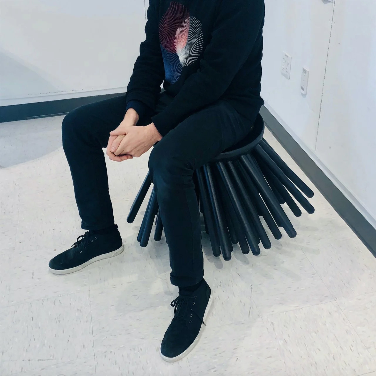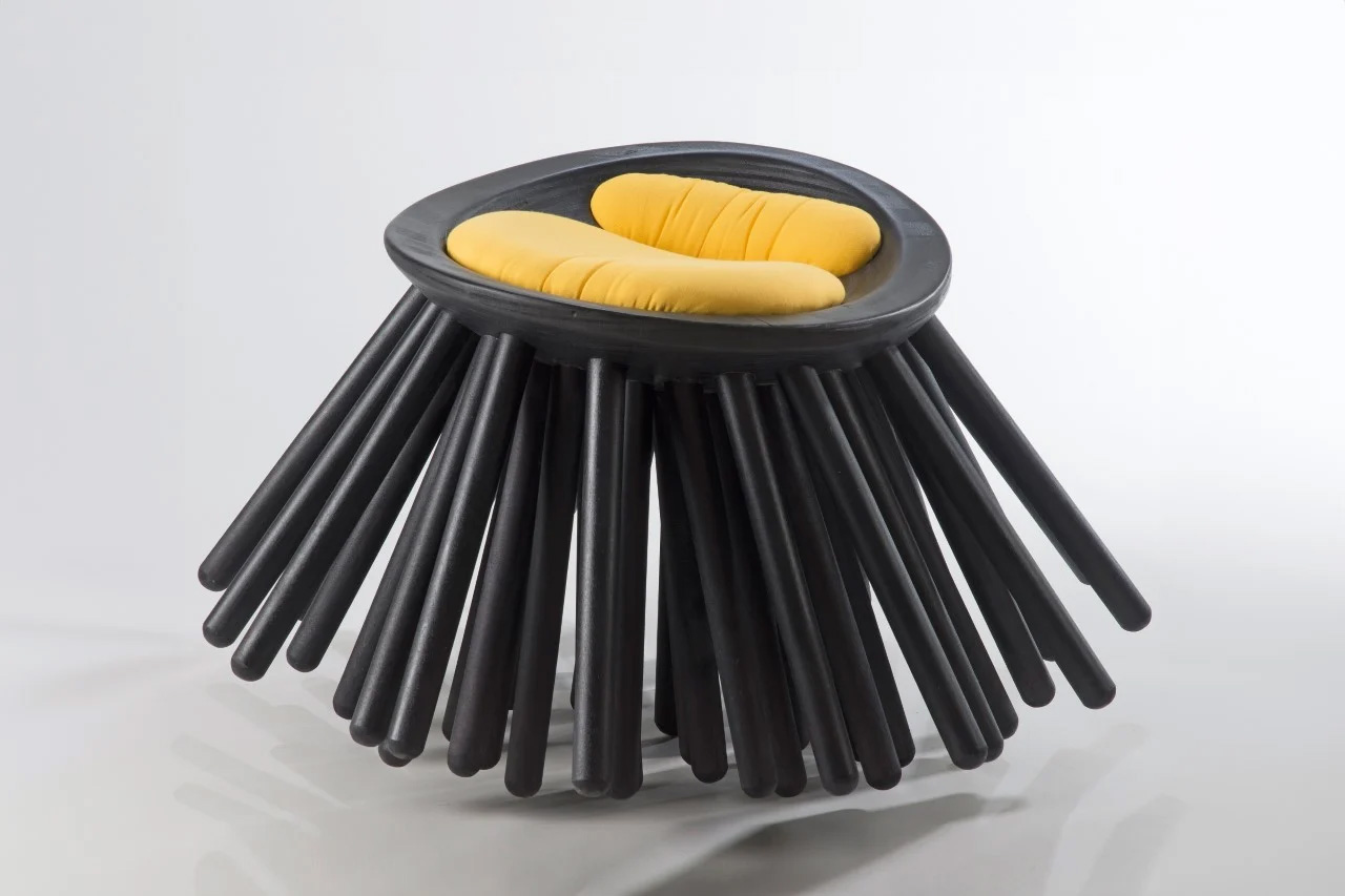 The SEAt Urchin stands out as a one-of-a-kind furniture piece with its remarkable 68-leg design, offering a deceptively smooth rocking motion without any risk of toppling over. Made from maple wood with individually attached wooden dowel legs, the SEAt Urchin Rocking Chair is both practical and visually striking. Its sleek matte black finish exudes elegance, while the vibrant yellow seat cushion adds a touch of color, grabbing your attention and instantly prompting your mind to make the sea urchin association. The seat cushions, meticulously stitched by hand, can be easily attached to the seat using Velcro. This convenient feature enables you to effortlessly alter the color and material of the cushions to match your personal style.
