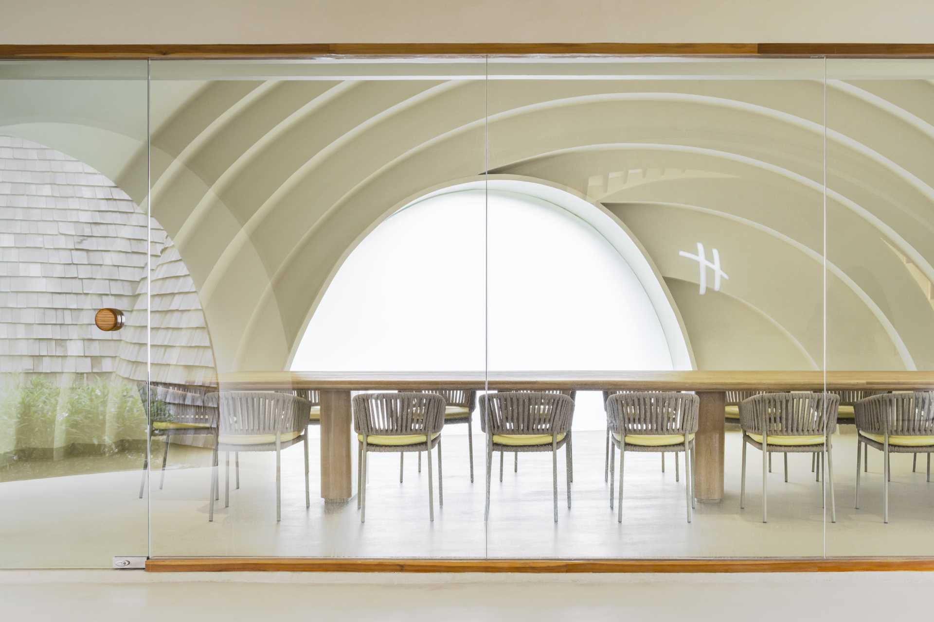 The fourth area includes a glass-enclosed conference room that enjoys views of the curved interior.
