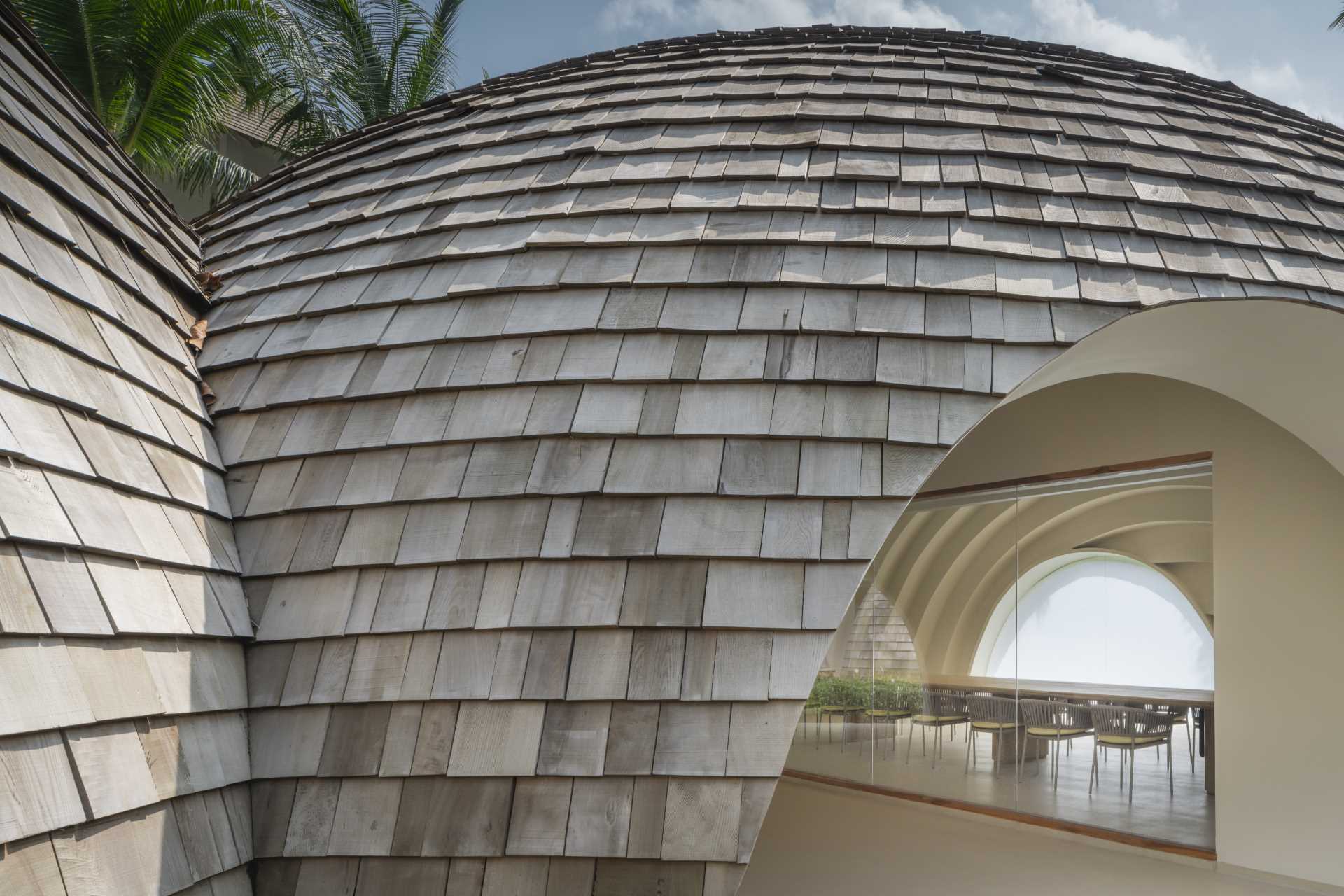 The curved building exterior is clad with wooden shingles, with openings giving a glimpse of the lobby inside.