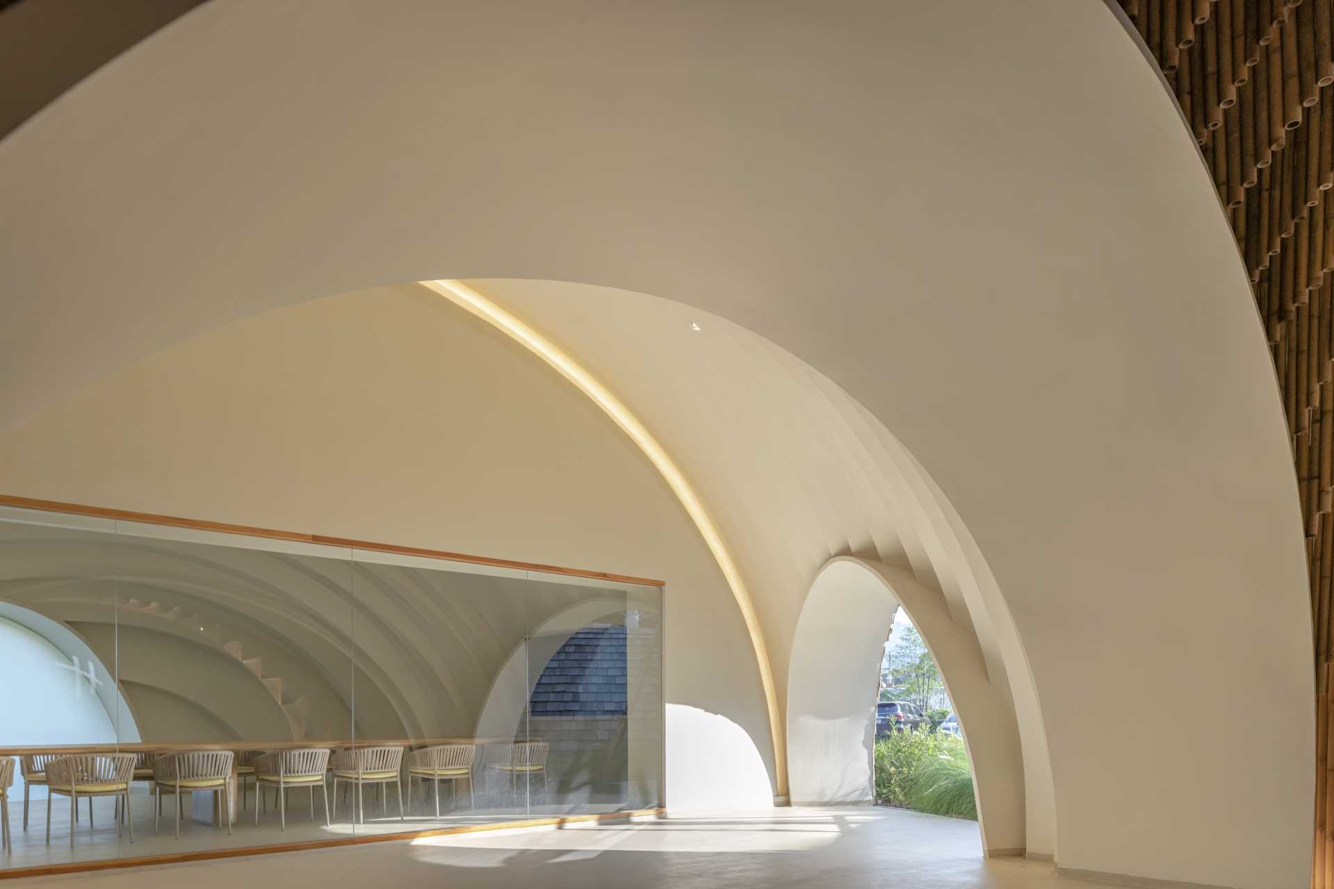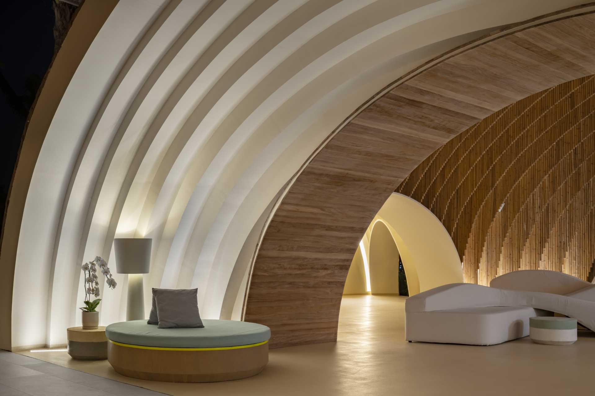 The third envelope is the hotel lobby, where all of the spaces are arranged in a linear organisation, directing the point of view of guests toward the sea. The lobby also includes hanging planes of bamboo and hidden lighting that highlights the design.