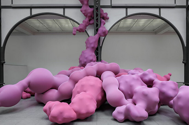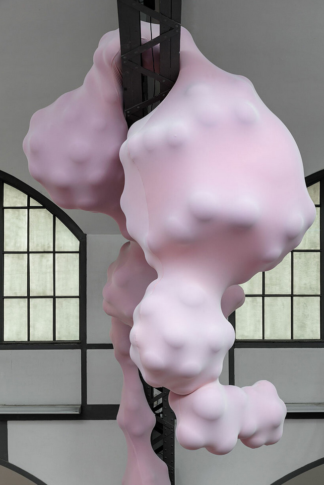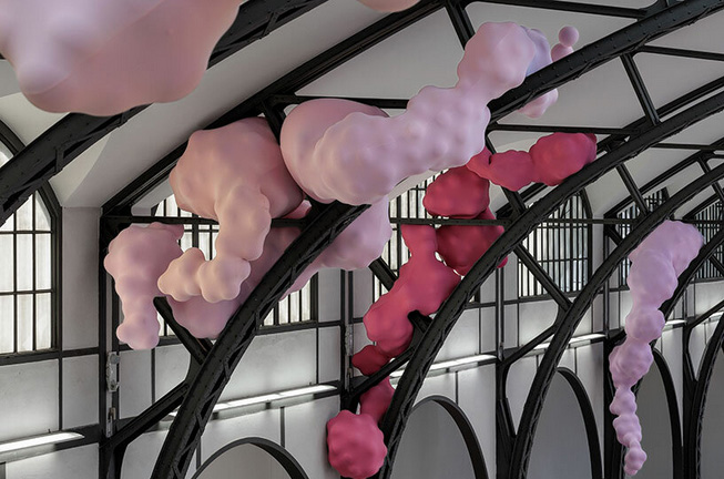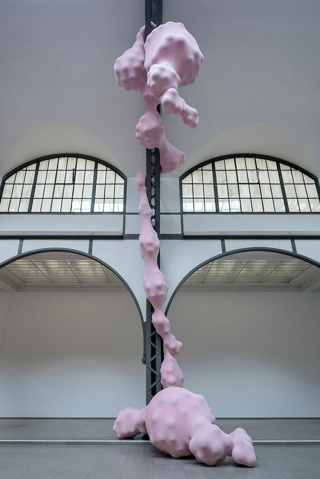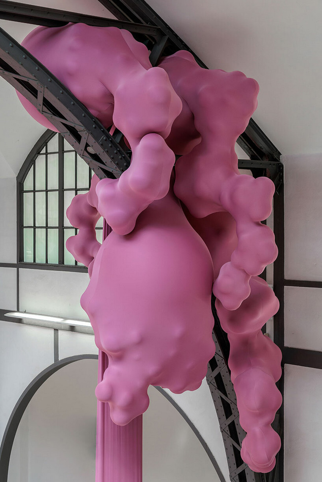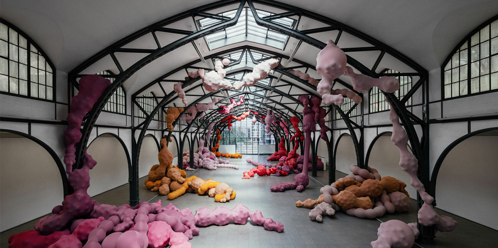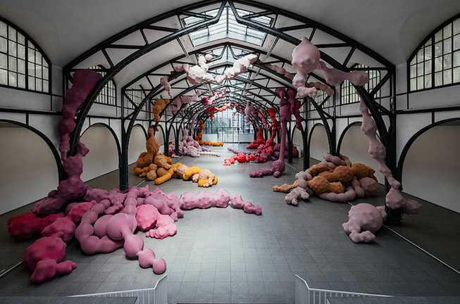 Designboom_ Following her exhibition at Centro Botín, Eva Fàbregas brings her inflated fleshlike sculptures to the Hamburger Bahnhof – Nationalgalerie der Gegenwart in Berlin. Titled Devouring Lovers, the vibrant showcase marks the artist’s largest solo exhibition to date and transforms the museum’s architecture, characterized by industrial iron girders, with her mesmerizing biomorphic installations. These works intertwine with the hall’s beams, evoking a surreal impression of organs growing from the metallic framework, converting the space into a ‘breathing organism’. The exhibition is on view until January 4th, 2024.