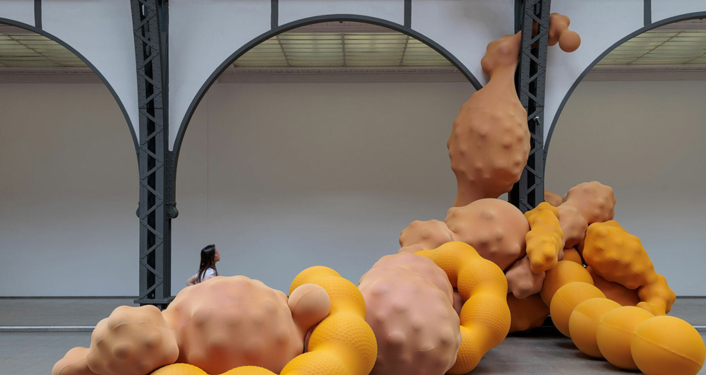 Expanding the boundaries of sculpture, Eva Fàbregas’ latest show at Hamburger Bahnhof – Nationalgalerie der Gegenwart invites visitors to a sensual, spatial experience. With this new commission, the Barcelona-based artist responds to the passage-like architecture of the museum’s main historical hall, by weaving 70 inflatable objects made of elastic fabrics and inflatable balls throughout the entire space. Soft and organic, these sculptures gracefully emerge from the sides, ceiling, and metal structures, emitting subtle vibrations that blur the line between the human and non-human worlds.