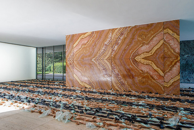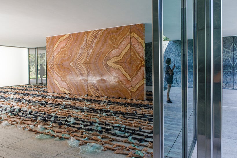 Designboom_ The Mies van der Rohe Foundation presents an itinerant installation by artist-architect Mark Cottle at the Barcelona Pavilion, dubbed ‘The Cost of Money: Raft’. Having begun in 2019 as a residency and exhibition at the Neura House in Silver Lake, Los Angeles, ‘The Cost of Money’ is an ongoing artistic project that draws attention to the very high human and environmental cost of capital worldwide. Cottle materializes his explorations by using emblematic works of modern architecture as a backdrop and element of interaction.