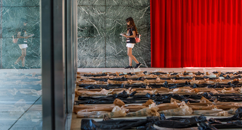 ‘With ‘The Cost of Money: Raft’, I have wanted to bring the discussion on the steep human price capital exacts, especially for the most vulnerable populations, and at enormous expense to the environment, to the Pavilion, a place that represents a moment in which industry was seen as a necessary tool towards the future but which already had a high social cost,’ Mark Cottle explains. The almost 10,000 plastic bags that make up the two carpet pieces have been selected and saved by the artist from the Spanish city’s garbage cans, eventually saving them from ending up in the trash container. Each carpet contains three groups of different colored bags.
