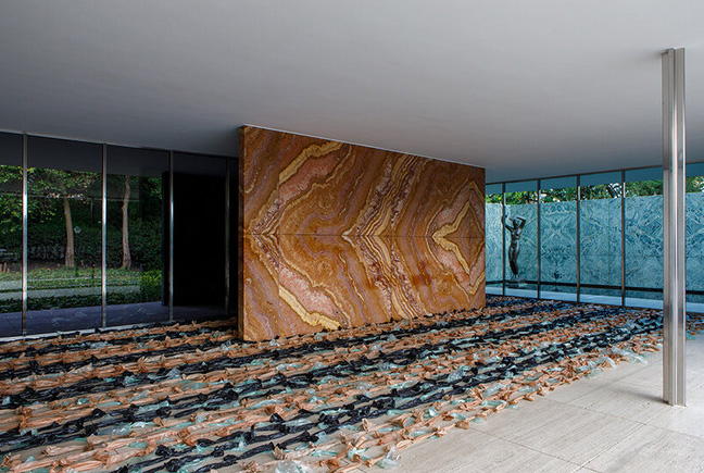 For this 2023 installation at the Barcelona Pavilion, Mark Cottle translates his reflections on that topic by filling the space with two large carpets of the same size (approximately 13 x 6 meters), each formed by a network of single-use plastic bags of different colors. One of the pieces is located inside the Pavilion and surrounds the onyx wall, occupying most of the floor of the noble room; the other piece sits outside at one end of the large pool, like a large raft.