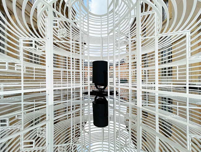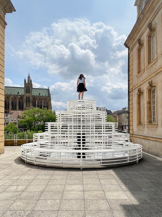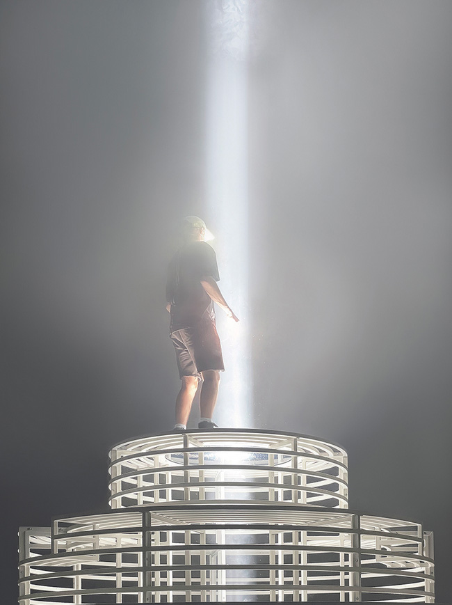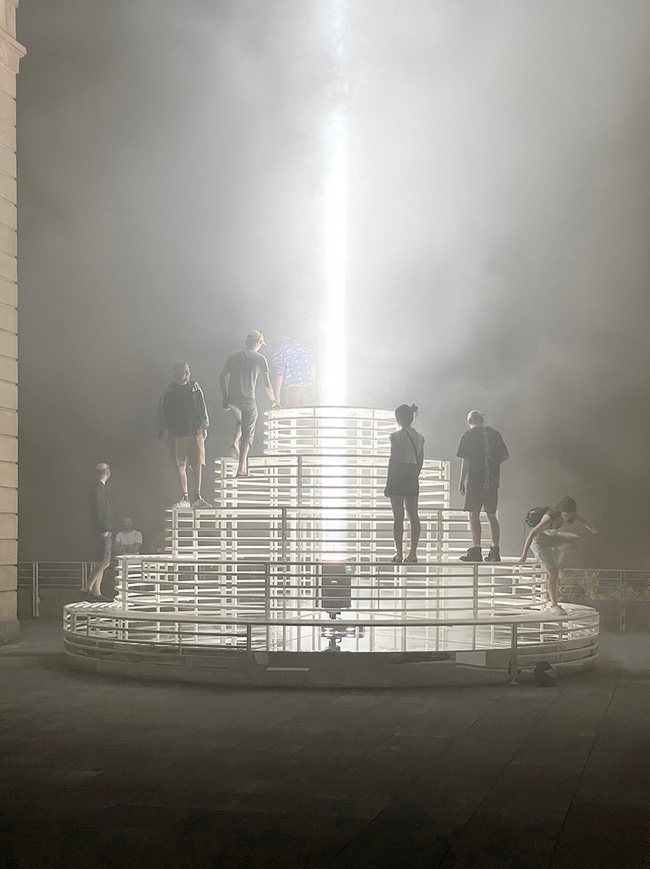 Designboom_ Settled in the heart of Metz, Relic is a luminous installation by Karolina Halatek and TETRO+A seeking to shift perceptions and offer a new sky tracing perspective. The vessel takes the form of a pyramid, comprising circular metal steps traversed by a vertical beam of white light which emits a gentle artificial fog. The upward-reaching beam extends into the sky, visible from afar and drawing crowds in like a magnetic force. The installation invites the audience to ascend to its pinnacle, immersing themselves in the interplay of light and fog, becoming, in essence, a living monument.