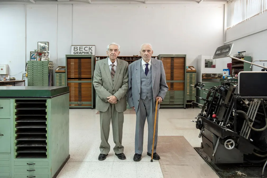 Alfred and Paul Beck took over the family printing business at the ages of 17 and 14 respectively. The brothers stand among the machinery that has passed down from generation to generation, reflecting the close bond between the two men. Alfred died late last year.