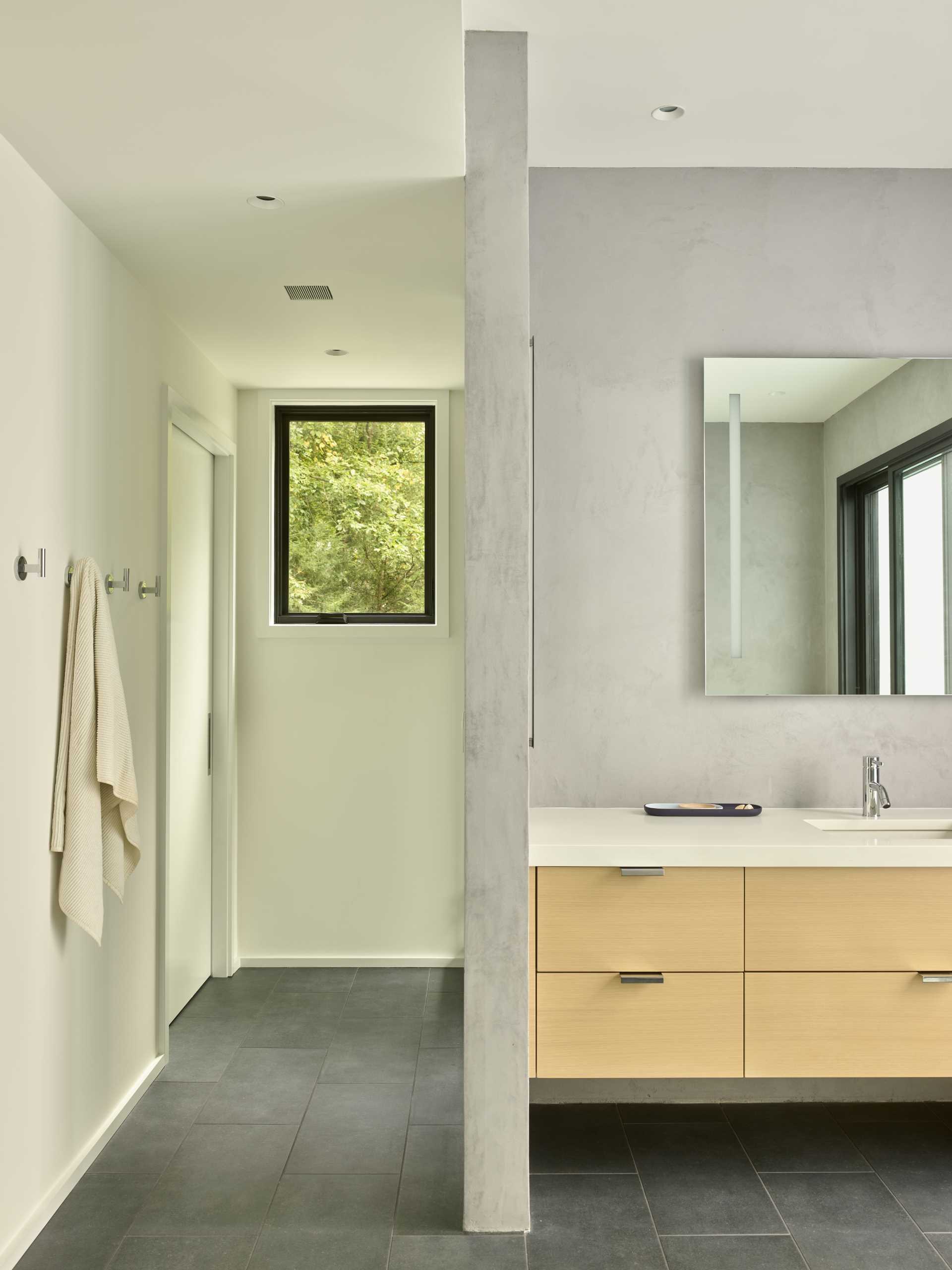 Views of the trees can also be seen from within the bathrooms, where the windows frame the forest as natural artwork.