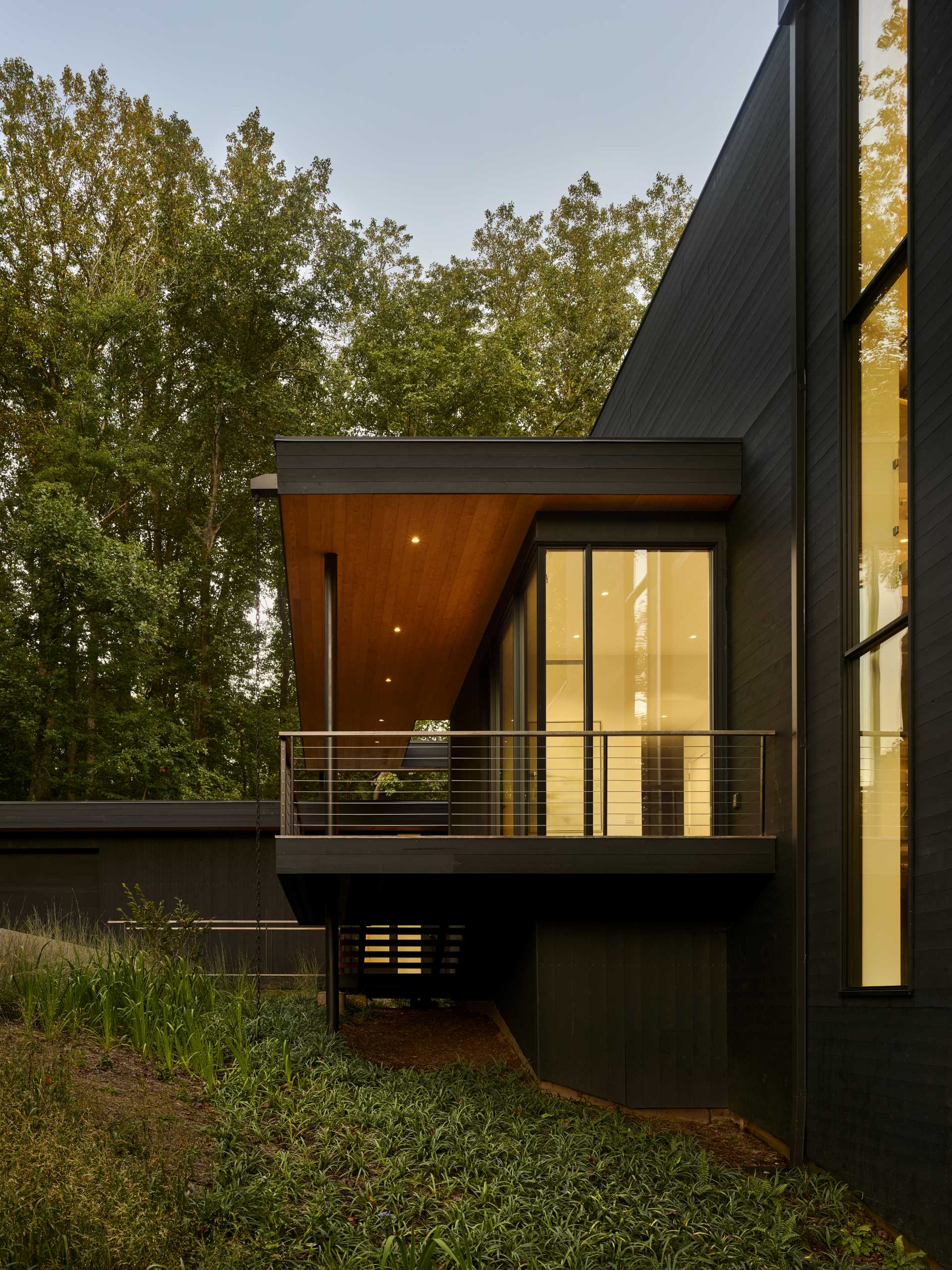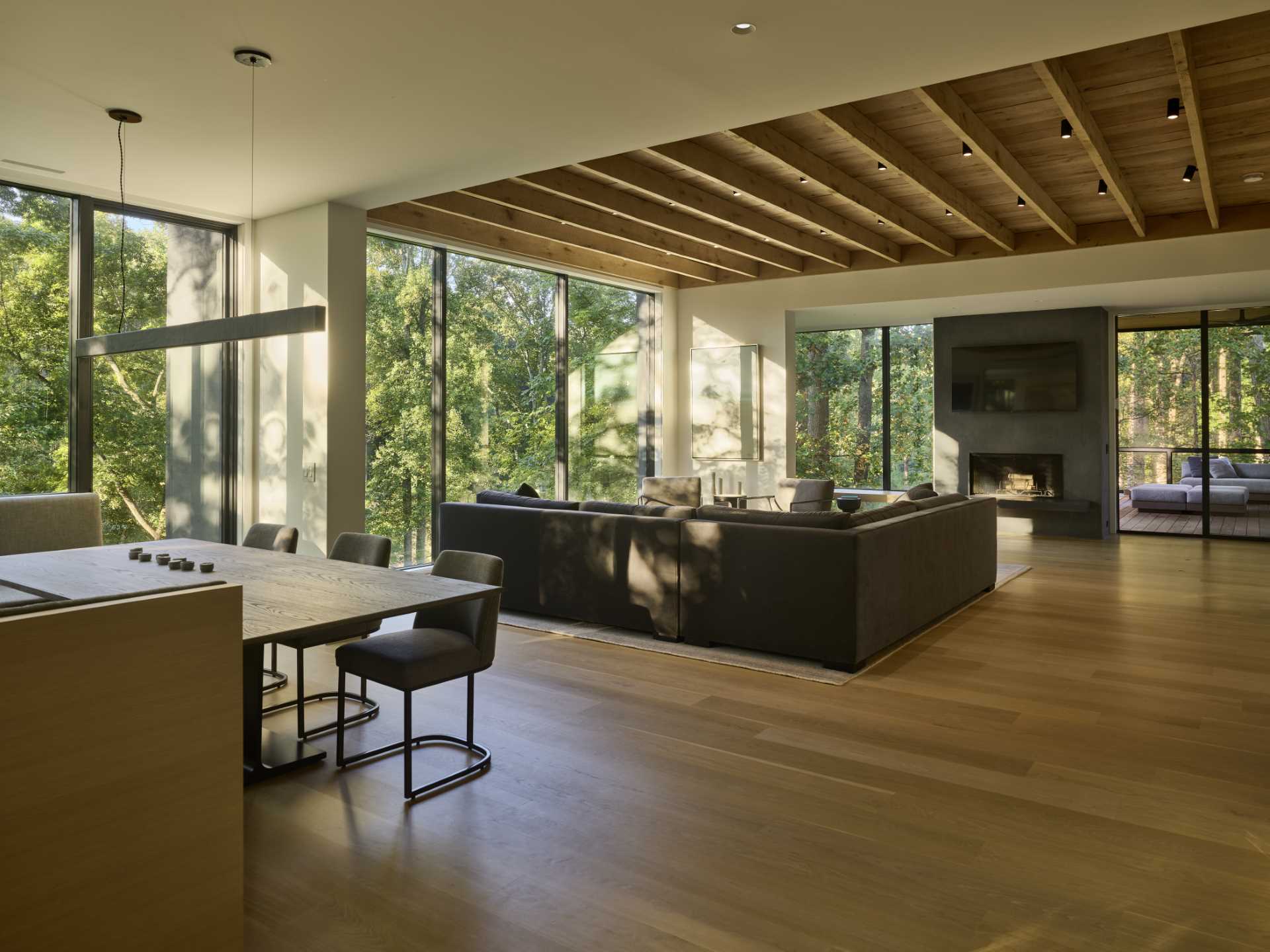 The home has solid walls that obscure neighbors while windows create different vantage points of the forest.