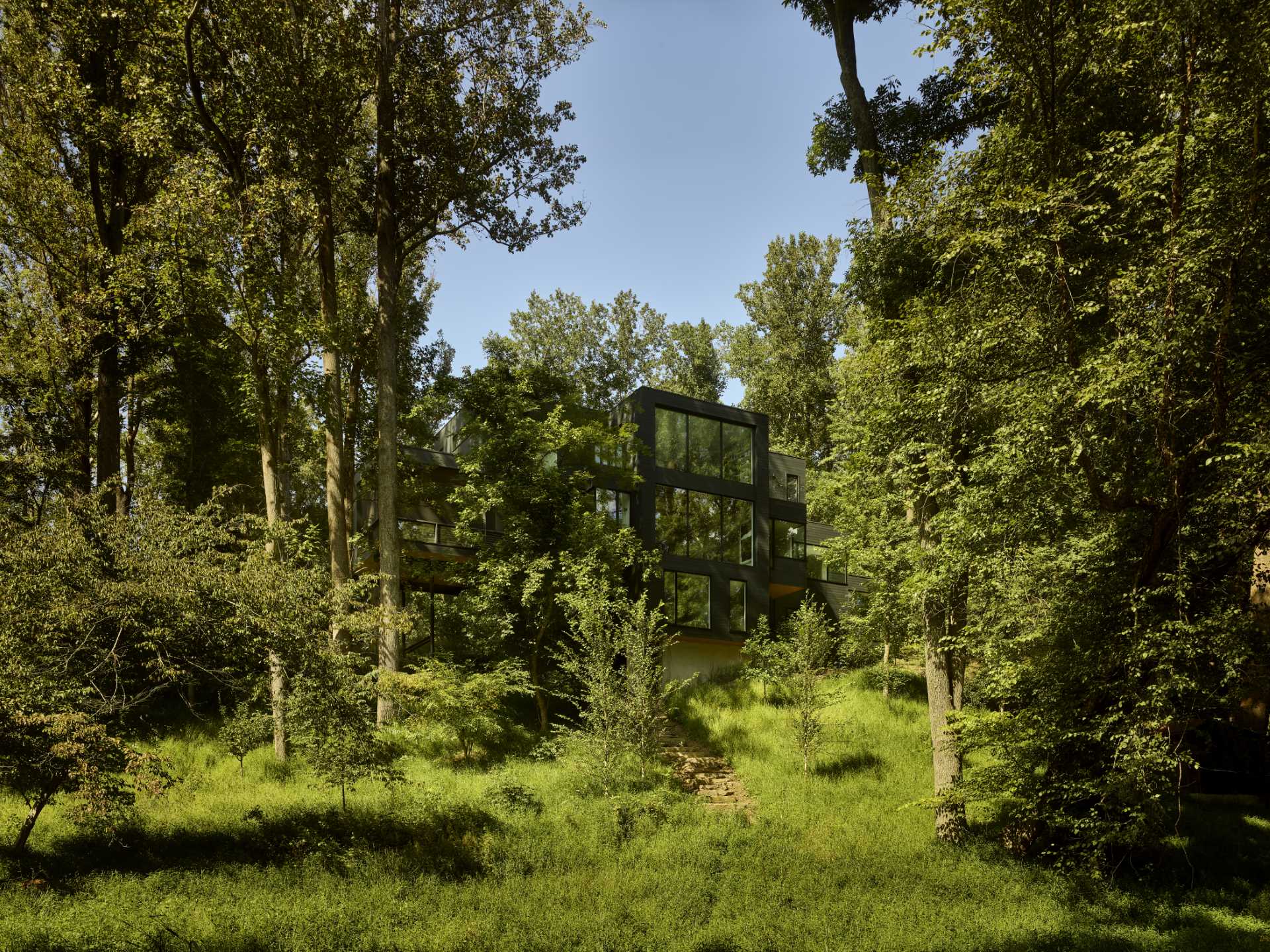 To capitalize on its wooded context, the architects perched most rooms above the forest floor, creating sightlines through the tree canopy.