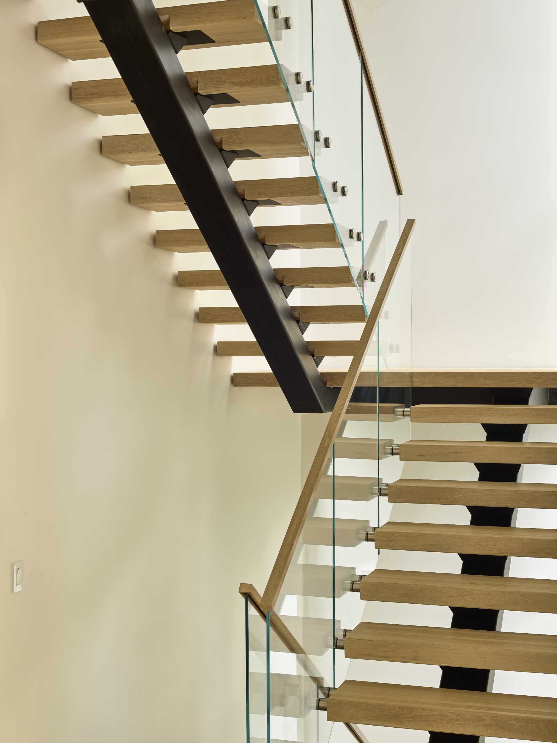 Wood and steel stairs with glass railings connect the various floors of the home.